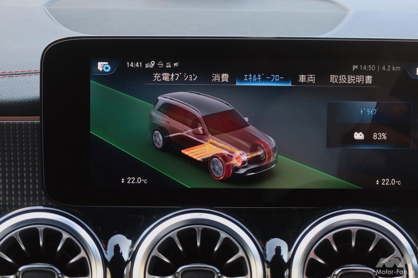 フロントにのみモーターを搭載するEQB 250が交流同期モーターを採用したのに対し、フロントとリヤにモーターを搭載するEQB 350 4MATICがフロントに交流誘導モーターを採用したのは、リヤのモーターをメインに使うためだ。センターディスプレイに「エネルギーフロー」を呼び出して(「ハイ、メルセデス」を合言葉にクルマとの対話で操作できるMBUXでも呼び出せる)エネルギーの流れを確かめてみると、確かに、発進時はリヤのモーターが駆動しているのがわかる。