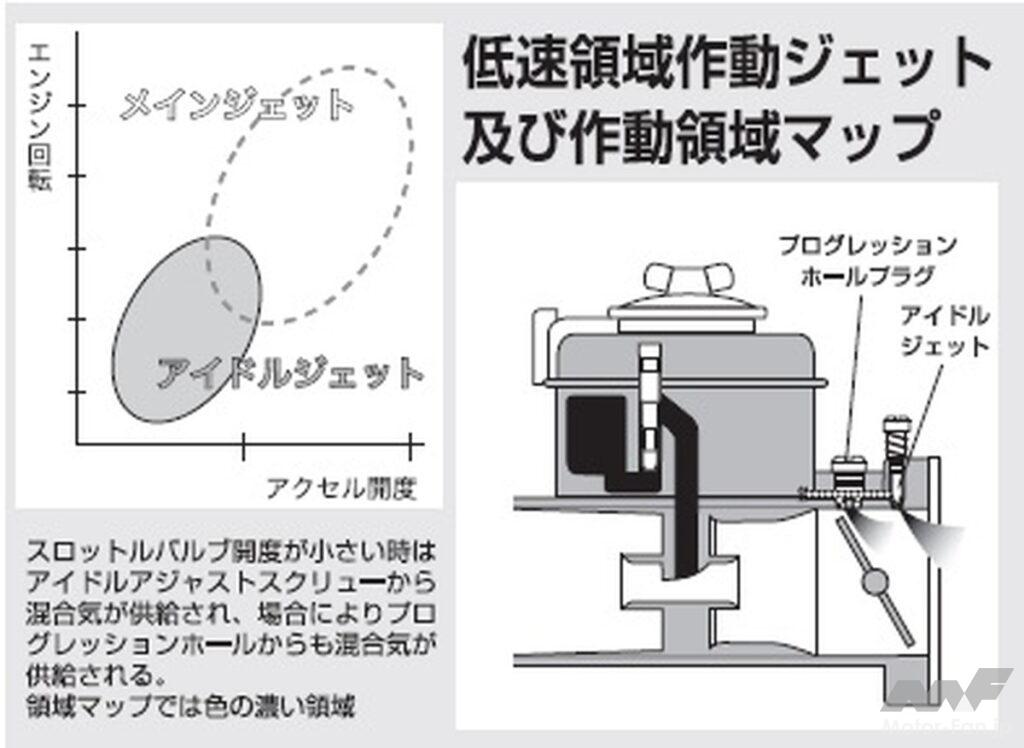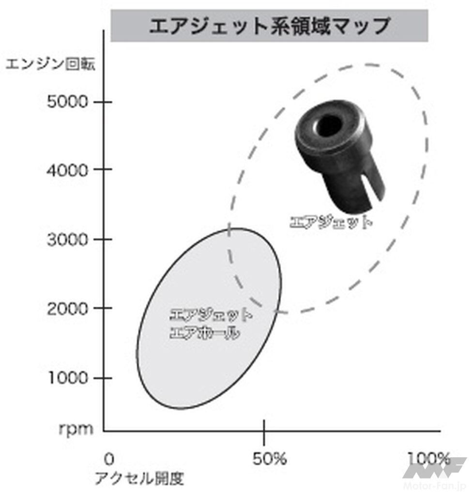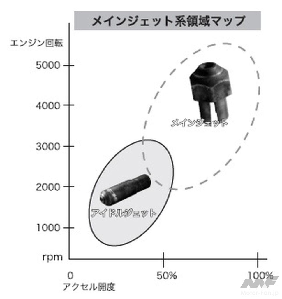 アイドリング状態の時はアクセル開度数%、エンジン回転750rpmあたりなので、アイドルジェットの領域に入っている。その後アクセルを踏んで20%〜25%で、エンジンは2000rpm〜3000rpmになり、少しずつメインジェットからも混合気が出始めてくる(円が重なっている所)。この様に各ジェットには開度と回転の合わせた領域があるのだ。