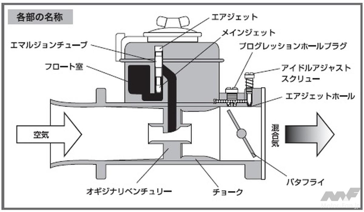薄いとき ・発進時に息付きをする(冷間時) ・急発進すると問題ないが、ゆっくり発進すると息付きがひどい。 ・アクセルを一気に戻すとパンパン音がする。 対処法 ・加速ポンプジェットを大きくする。 ・アイドルジェットのサイズを上げるか、Fナンバーでエアホールを小さくする。 ・アイドルジェットのサイズを上げるか、Fナンバーでエアホールを小さくする。