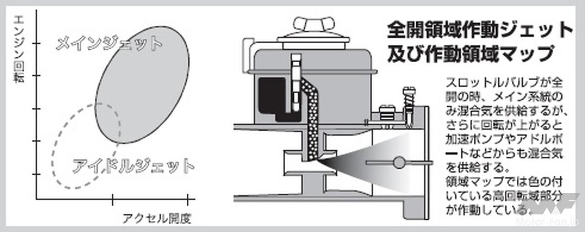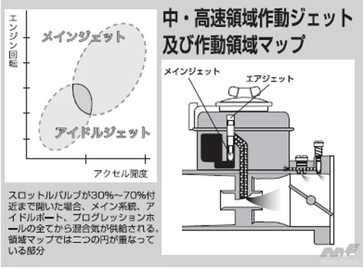 アイドリング状態の時はアクセル開度数%、エンジン回転750rpmあたりなので、アイドルジェットの領域に入っている。その後アクセルを踏んで20%〜25%で、エンジンは2000rpm〜3000rpmになり、少しずつメインジェットからも混合気が出始めてくる(円が重なっている所)。この様に各ジェットには開度と回転の合わせた領域があるのだ。