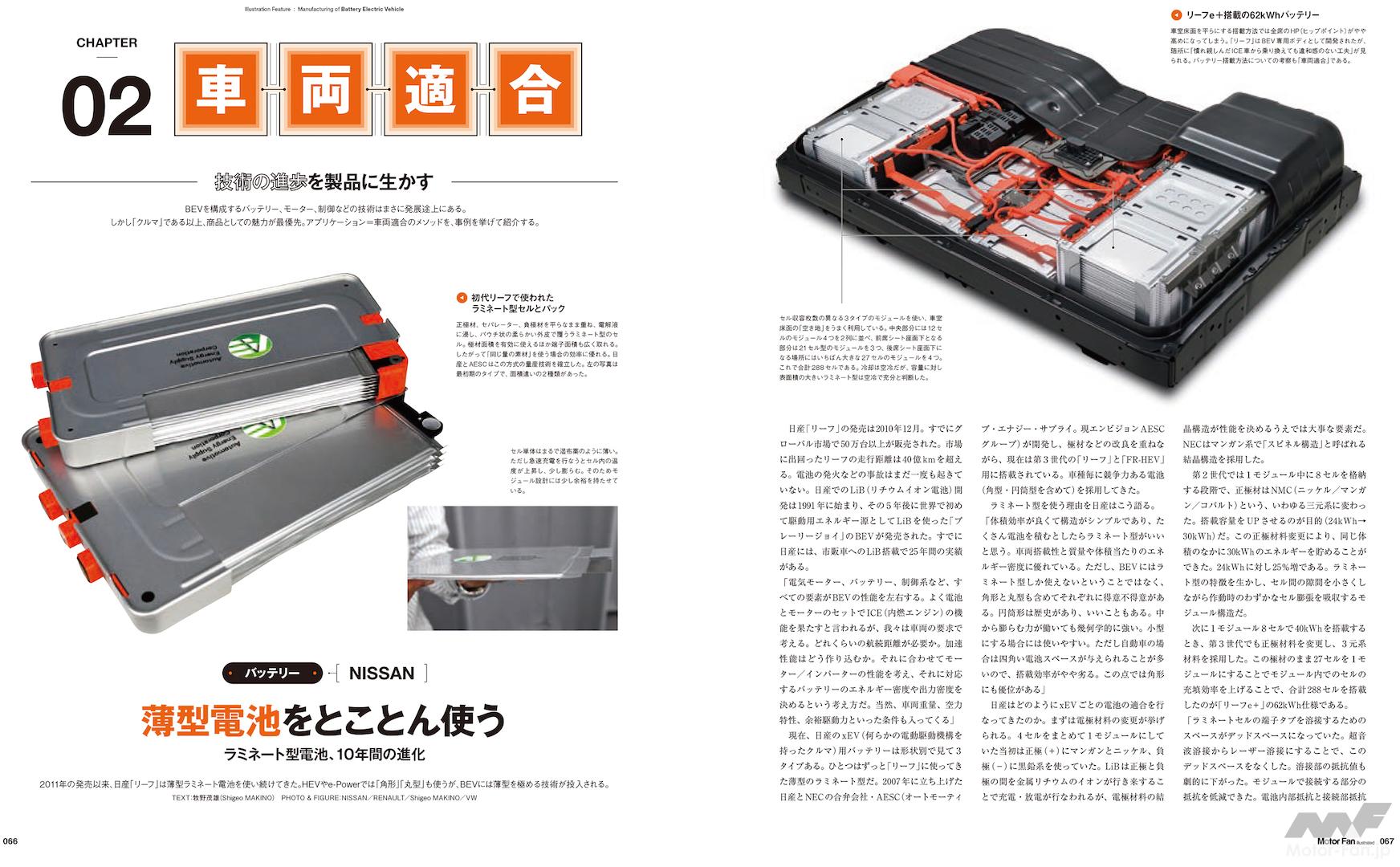 BEV(電気自動車)を構成するバッテリー、 モーター、 制御などの技術はまだ発展途上にあります。 しかし、 クルマである以上、 商品としての魅力が最優先です。 日産のラミネート型電池、 東芝の「5分で80%の充電」実現を目指す次世代電池、 レクサスによるNVHと足まわりの対策、 マツダのパッシブセーフティ技術などアプリケーション=車両適合のメソッドを、 事例を挙げて紹介しています。