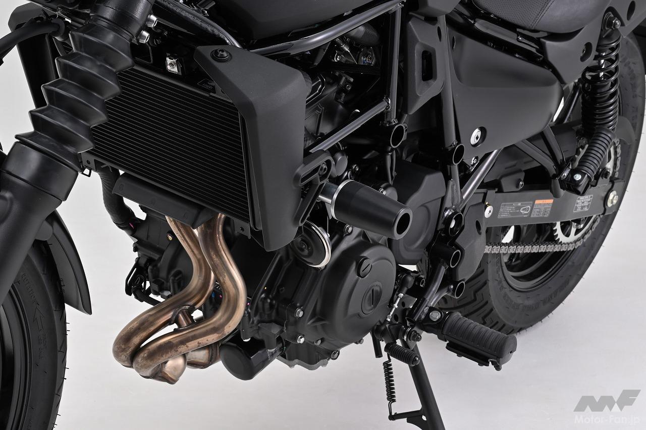 車体のフレームデザインに合わせつつマットブラック仕上げとし、大きく張り出さないからワル目立ちしないのがポイント。脱着がしやすい左右セパレート式でマフラーなどを取り外すことなく取り付けが可能だ。