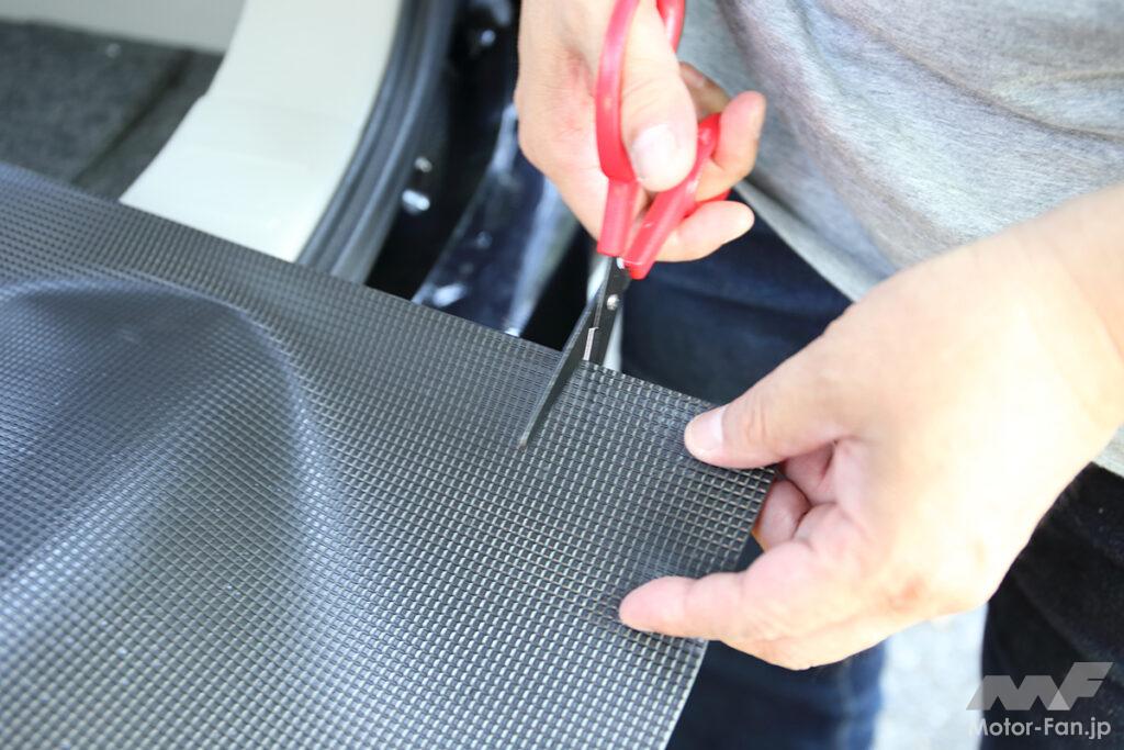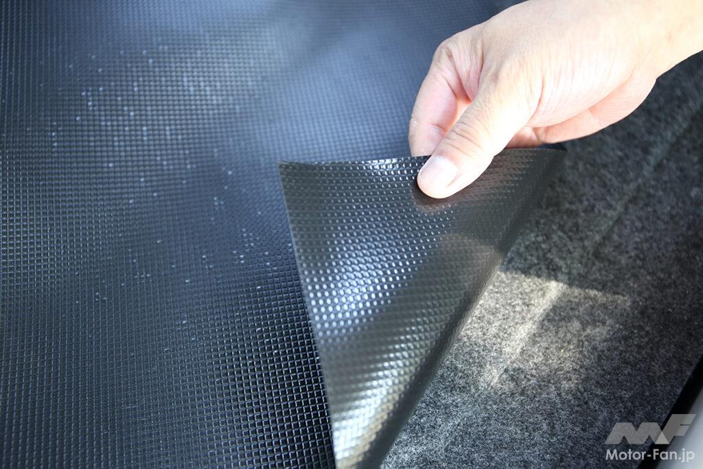 薄型のため、カットはハサミやカッターで容易に行なうこともでき、それこそ家庭用でも充分だろう。直線的なカットだけでなく、曲線カットも問題なし。それでいて、小型にカット後も、弾力性を持つ分単体での重量感もあるため、接着固定などを行なわなくても自重で滑らず配置できる。それこそ車内装の各所にアレンジすれば、さまざまな用途に力を発揮してくれるだろう。