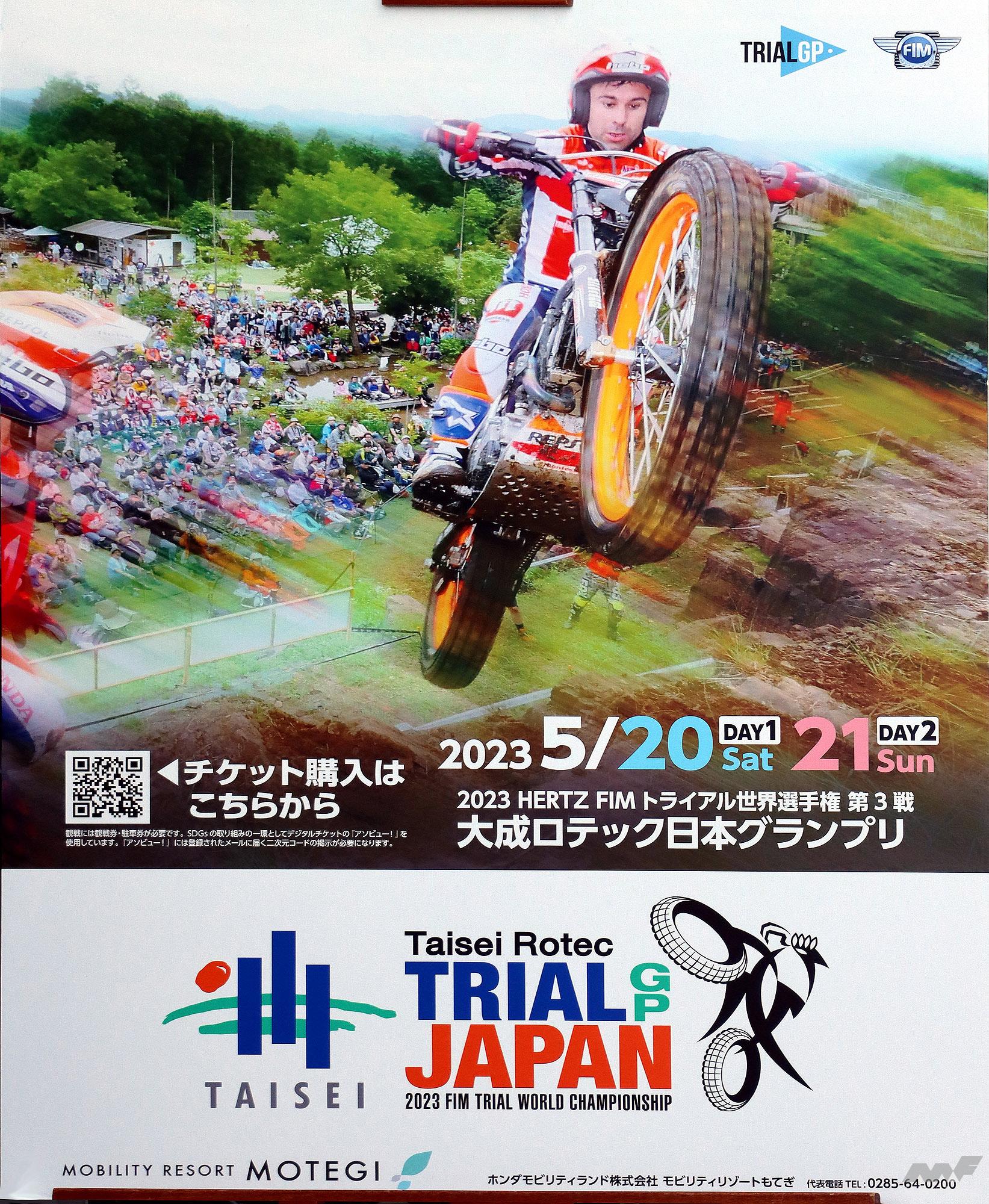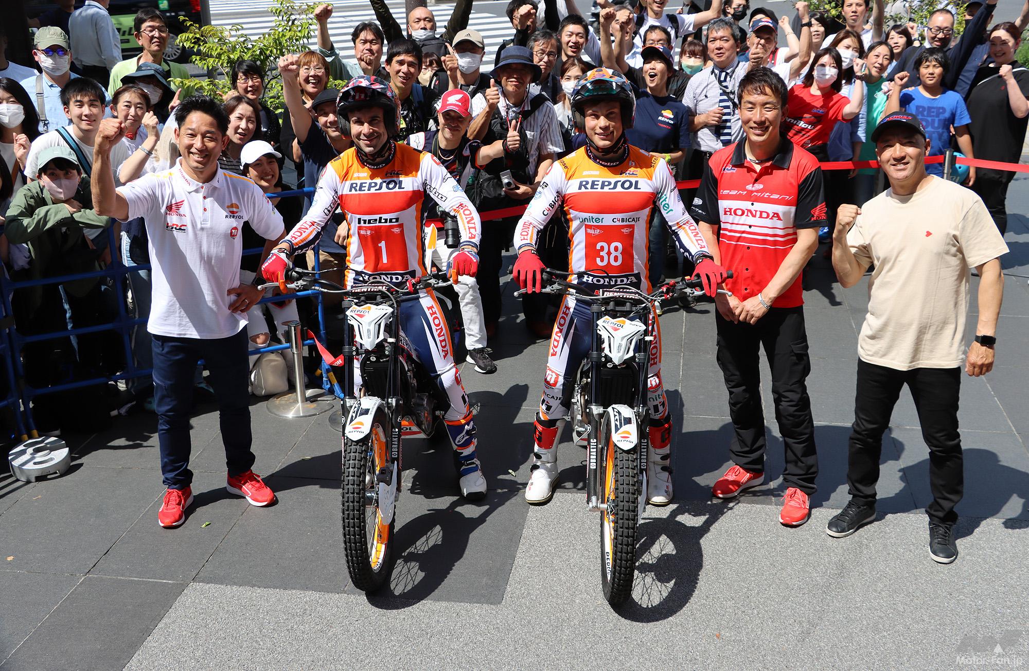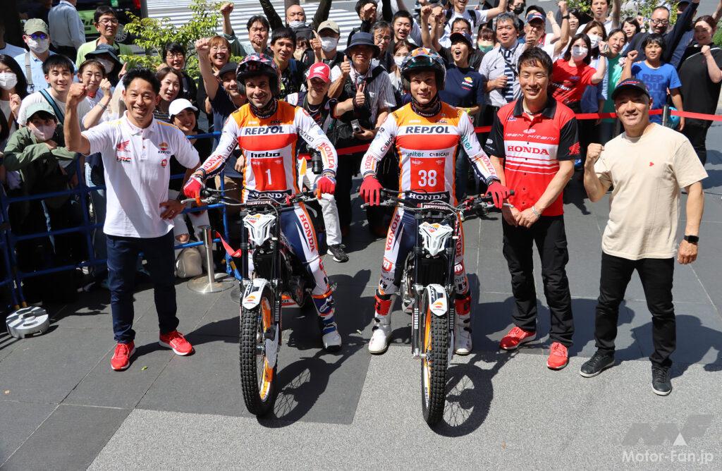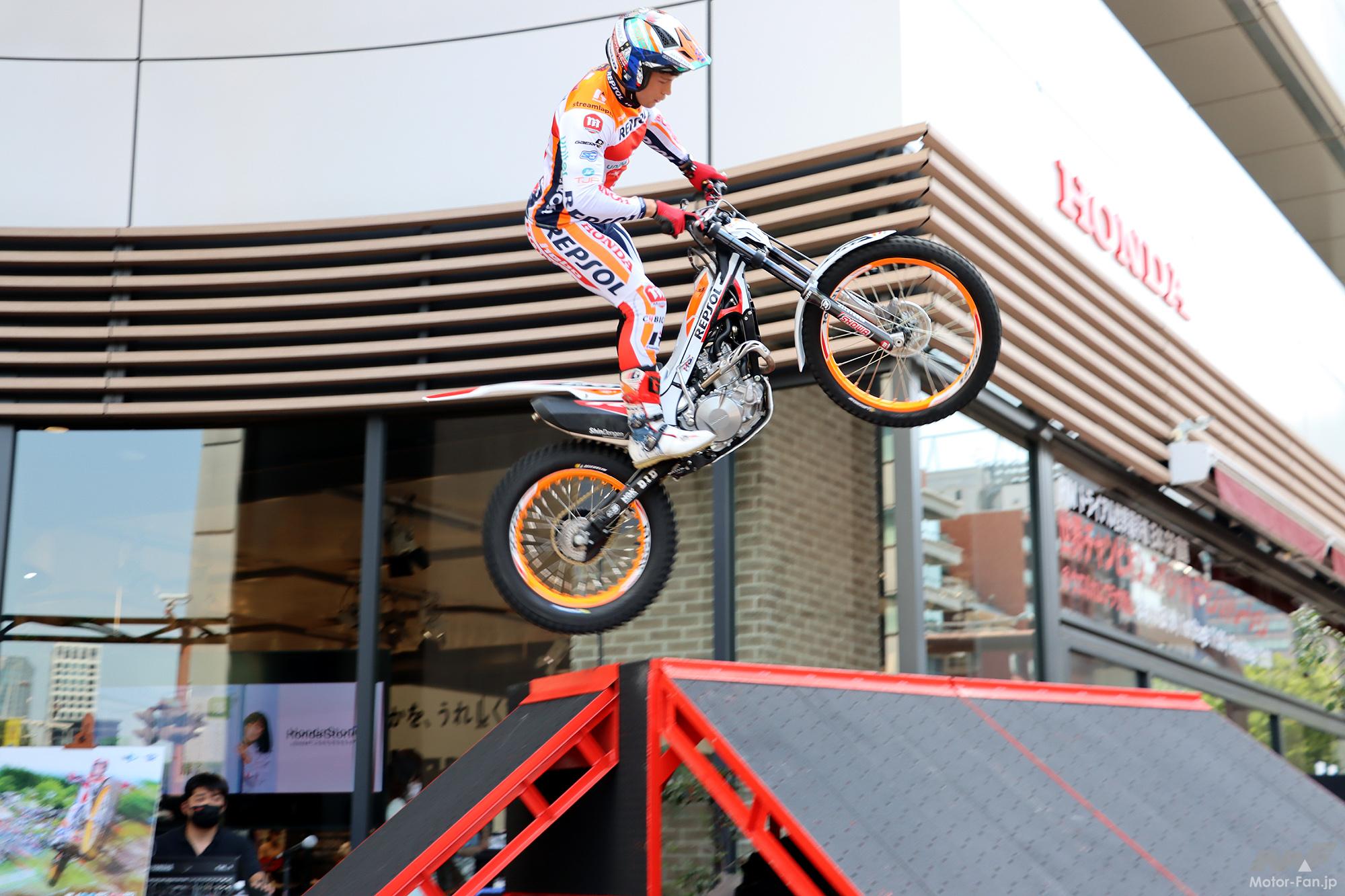 トライアルファンなら誰もが知っている「トニー・ボウ」と昨年ランキング5位の「ガブリエル・マルセリ」両選手。ボウは16年連続で世界選手権シリーズチャンピオンに輝いた最強の男。マルセリは昨年からRepsl Honda Teamに加入した期待の若手(23歳)で、いずれもスペイン出身のライダーである。Hondaウェルカムプラザ青山前のテラスに造られた特設会場。先ず彼らは柵越えのハイジャンプで登場し観客の度肝を抜いた。本来トライアルは自然の地形の中に設けられる難しセクションを如何にして巧みに(足をつかずに)クリア(クリーンと言う)できるか、ライディングテクニックを競う競技である。常人では考えられない、バイクを思いのままに制御する妙技は、観る者を魅了することは間違いない。20、21日の土日は、ボウやマルセリなど、世界で戦うトップクラスのトライアルライダーがモビリティリゾートもてぎの会場に集結。日本で観戦できる世界一流の攻防は、バイクファンでなくても一見の価値がある。