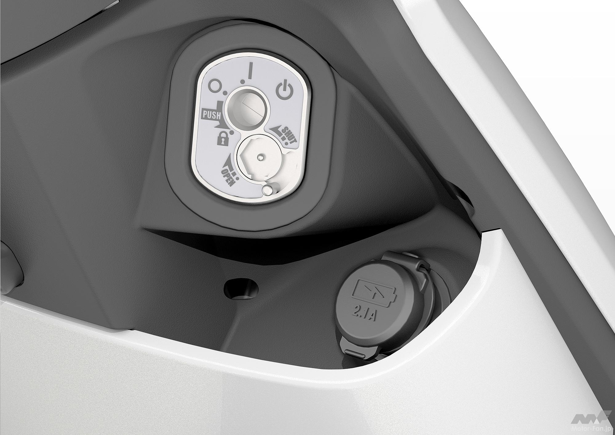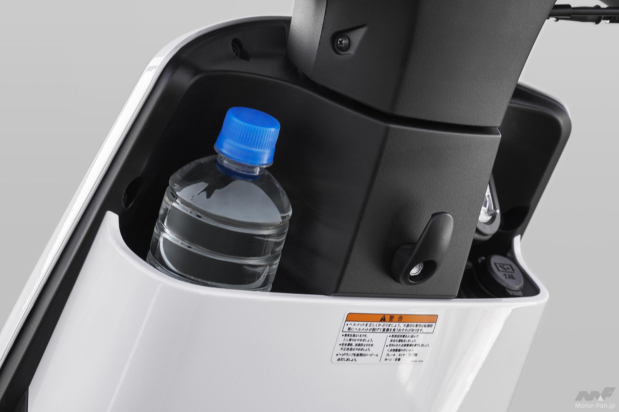 ただ、シート下のメットイン構造は残されていた。EM1 eではバッテリースペースに使われてしまい、メットインと言う意味での使い勝手の便利さがスポイルされたのは少々残念。EM1 eには、ヘルメットホルダーがシート下前方2ヶ所に装備されており、写真で示す通り収納スペースは3.3Lと小さい。