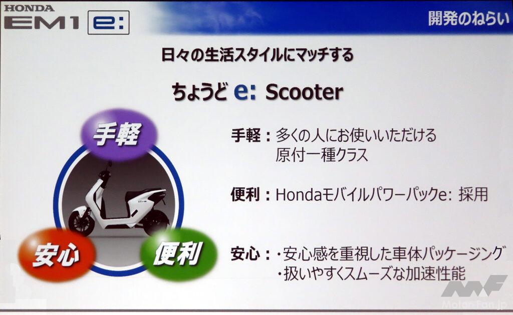 EM1 eは原付一種、つまり50ccスクーターに相当する電動スクーターである。プレスリリースから引用すると、開発のねらいは「日々の生活スタイルにマッチするちょうどe:Scooter 」。手軽で便利、そして安心して使える、乗り手を選ばないパーソナルコミューターである。
