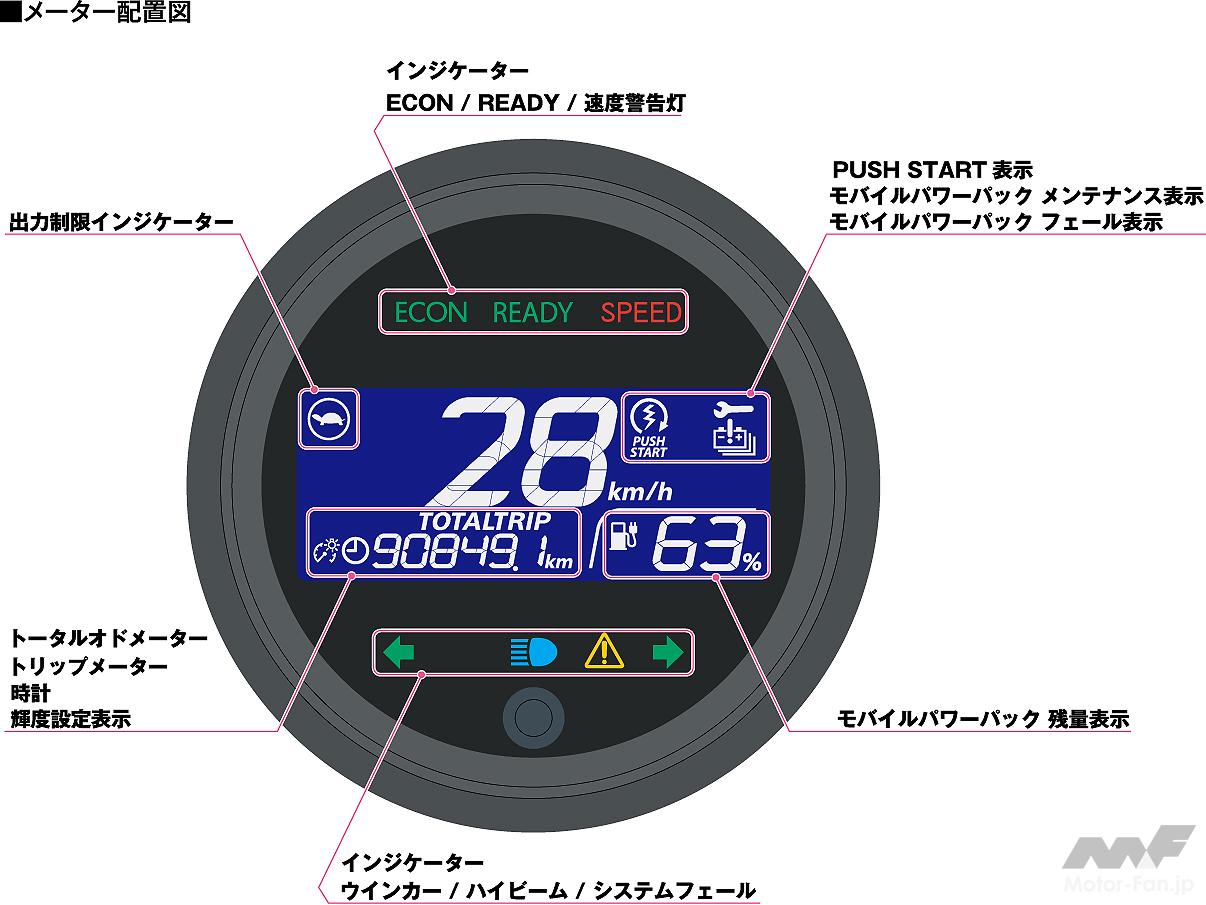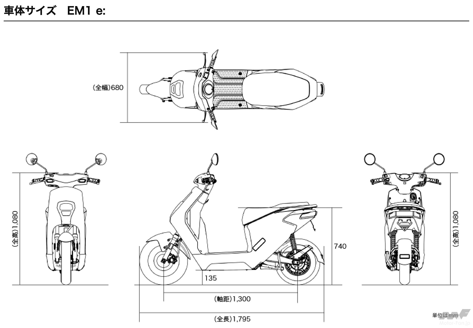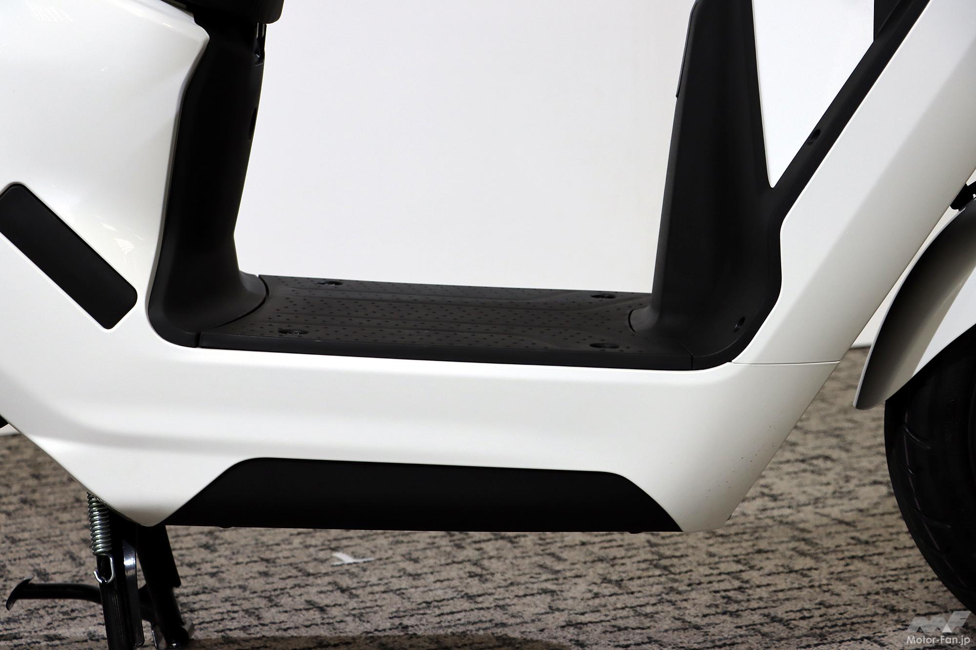 シート高は20mm高い740mm。車重は13kg重い92kgある。もっとも搭載バッテリー(Honda Mobile Power Pack e)の重さが10.3kgだから、車体の重さはほぼ同レベルにあると理解して良いだろう。