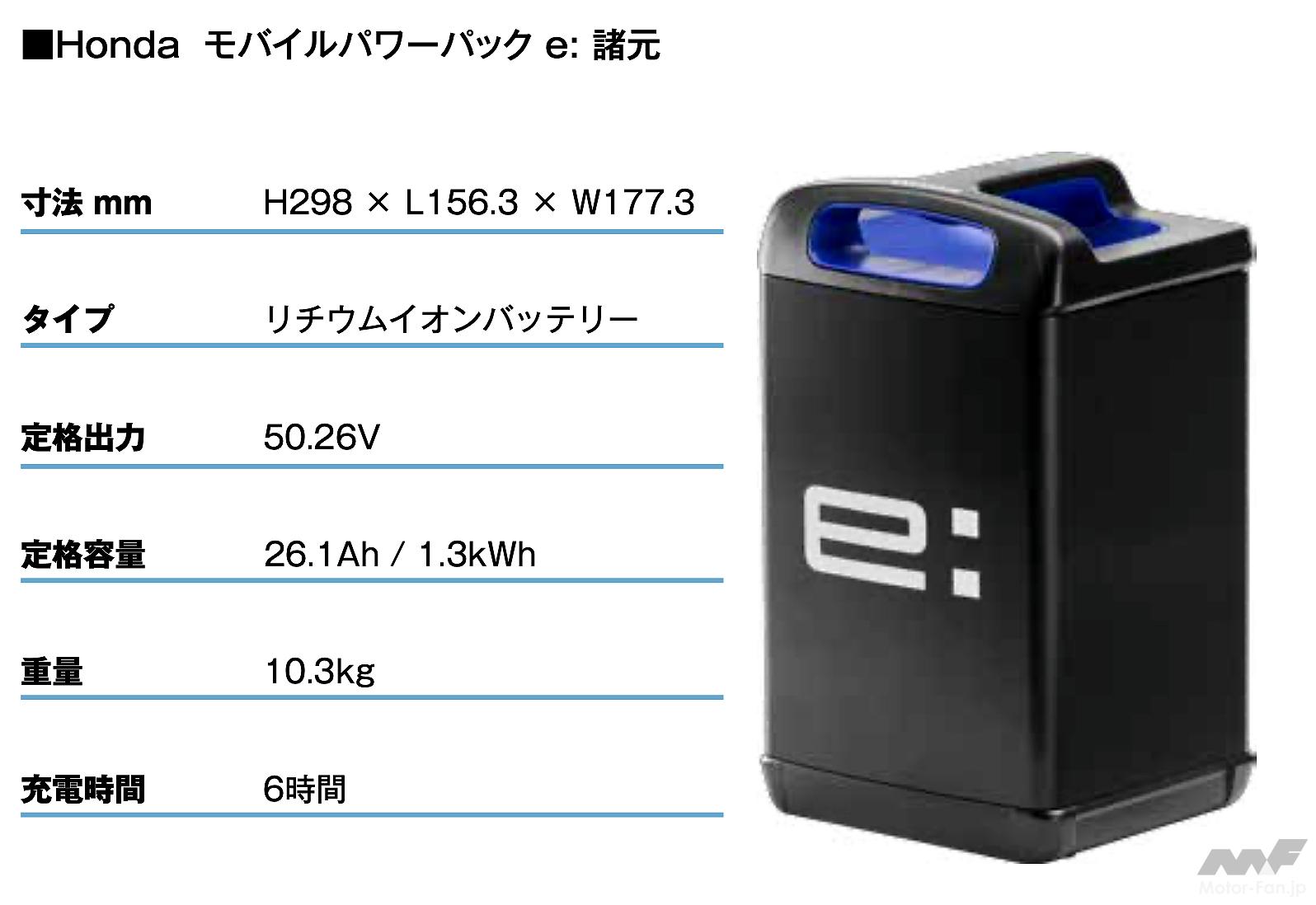 もっとも、モバイルパワーパックeは脱着が簡単で、部屋に持ち込んで充電できることと、今後は汎用バッテリーとして活用用途が膨らむことが期待されている。将来展望としては同電池の普及促進を進め、例えば出先で充電済みバッテリーとの交換制度などが広まれば、スクーターのみならず、多方面で役立つ電池となる可能性は大きい。