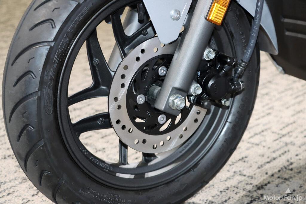 フロントの左側に採用されているのは、φ190mmシングルディスクローター。油圧キャリパーは、NISSIN製1ピストンのピンスライド式が装備されている。