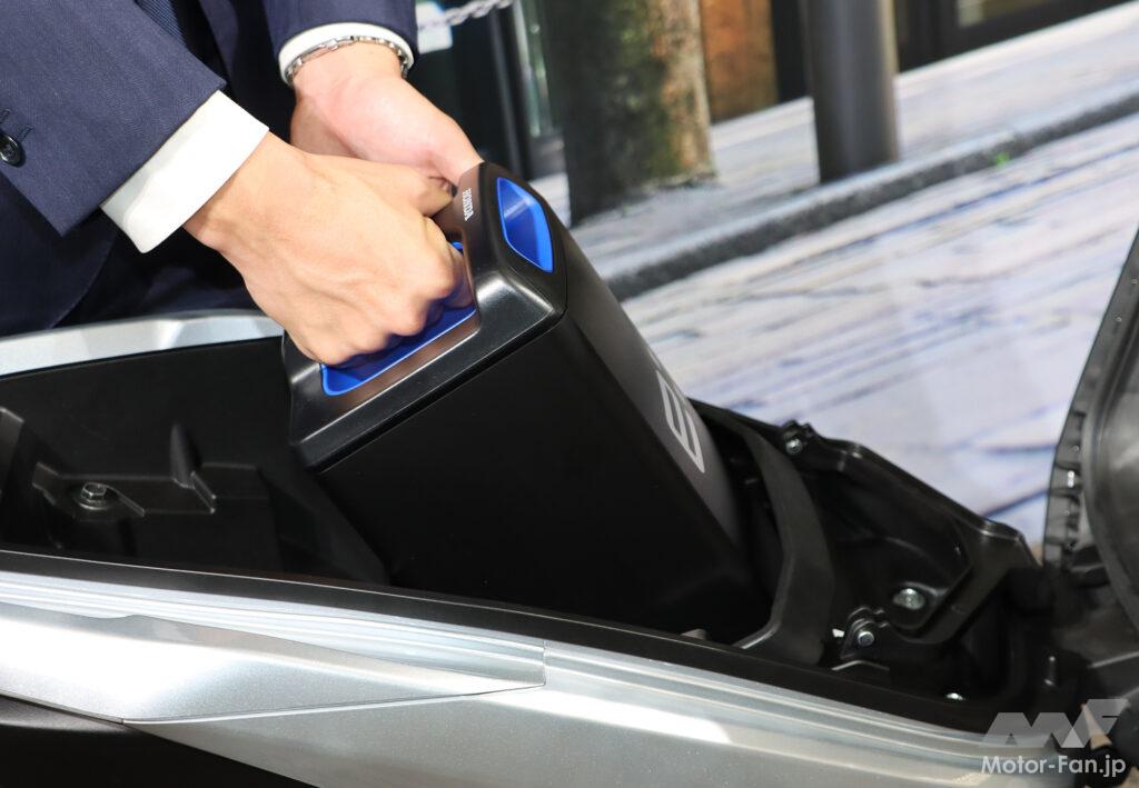 前ヒンジで前方に開くシートの下に、動力用のメインバッテリーを搭載。扱いが重いが簡単に抜き差しできる。