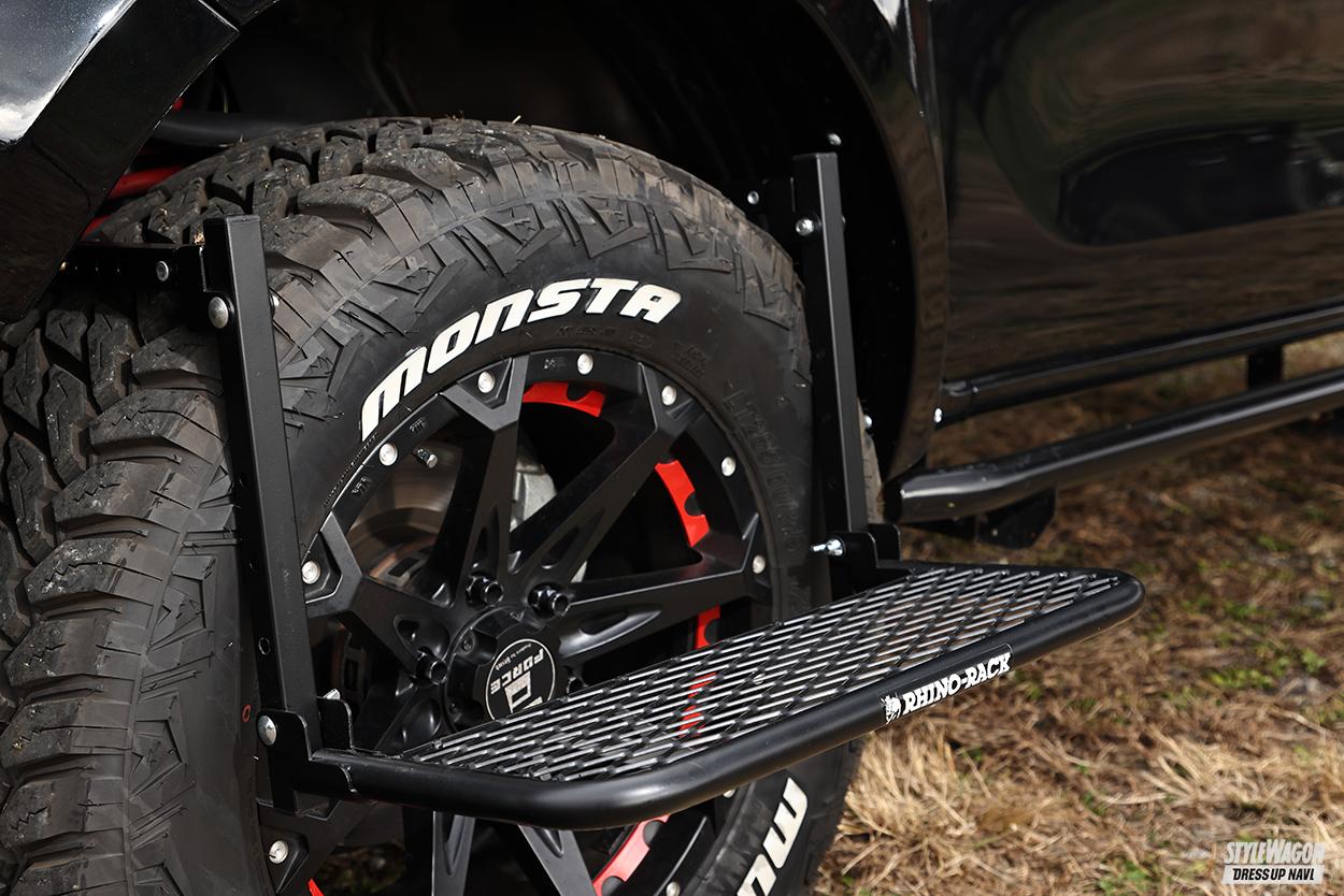 タイヤ(モンスタタイヤ)&ホイール(フォース)も取扱ブランド、追加ランプはKCで、オーニングはすっかり有名になったライノラック。多くの人々が憧れるブランドを贅沢に身に纏ったハイラックス。アウトドア派やオーバーランダーの視線を一身に集めるのは当然のことなのである。
