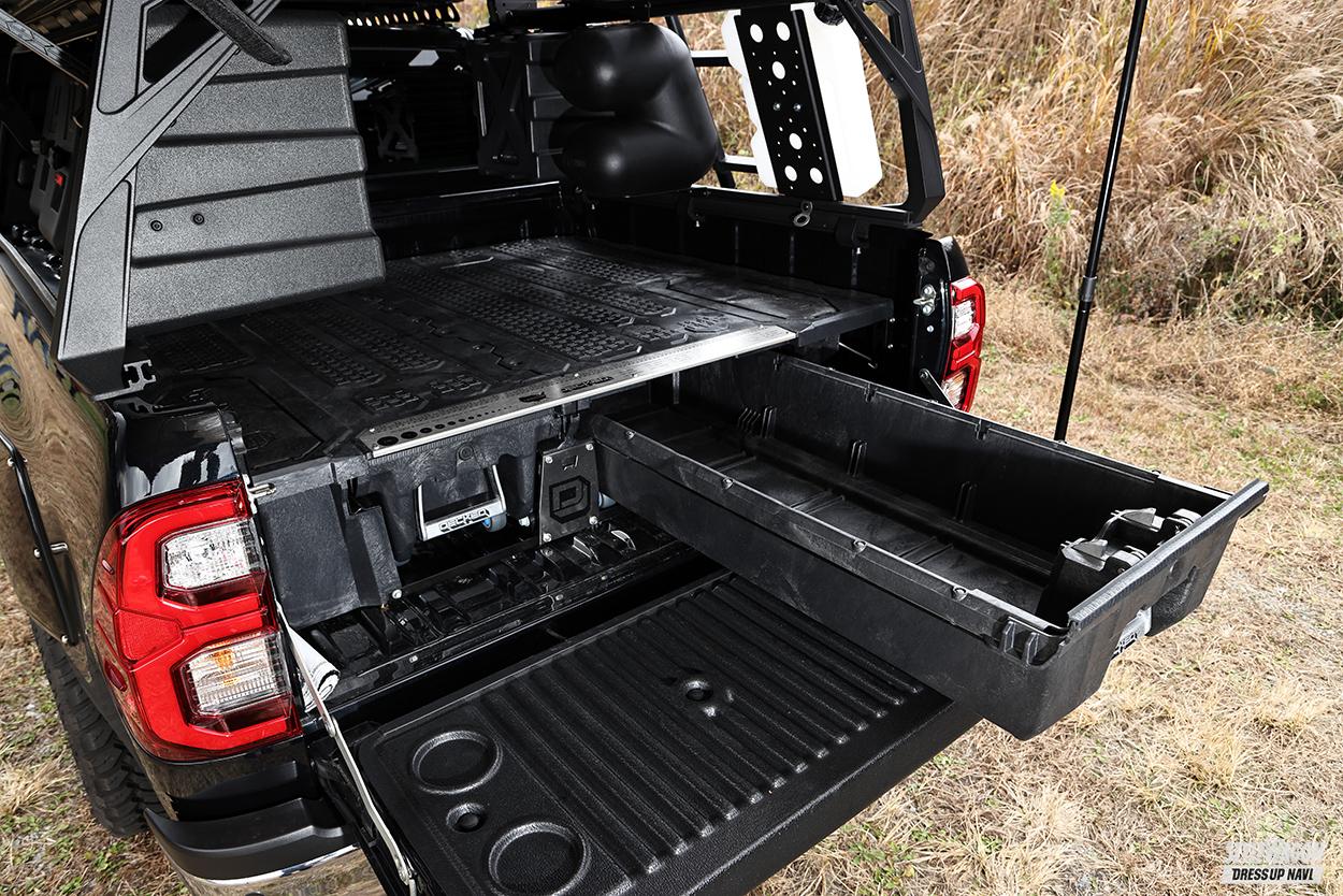 タコマ風フェイスにできる『タコマックス』キットも特徴的だが、ベッド(荷台)まわりの仕上げに注目しないワケにいかない。レイトナーのベッドラックがキーアイテムで、オプションのケース&ボックス、シャワーを追加して機能性を高めている(ロトパックス製タンクをマウントできるプレートも用意)。さらに上にはルーフテント(ローム製をチョイス)まで設置でき……。このラック、エクシズルラインがレイトナーに働きかけたことで実現。無加工で装着できる点もポイントだ。下側にはデックドのスライド式トレイがつき、収納スペースの確保&空間を有効活用している。
