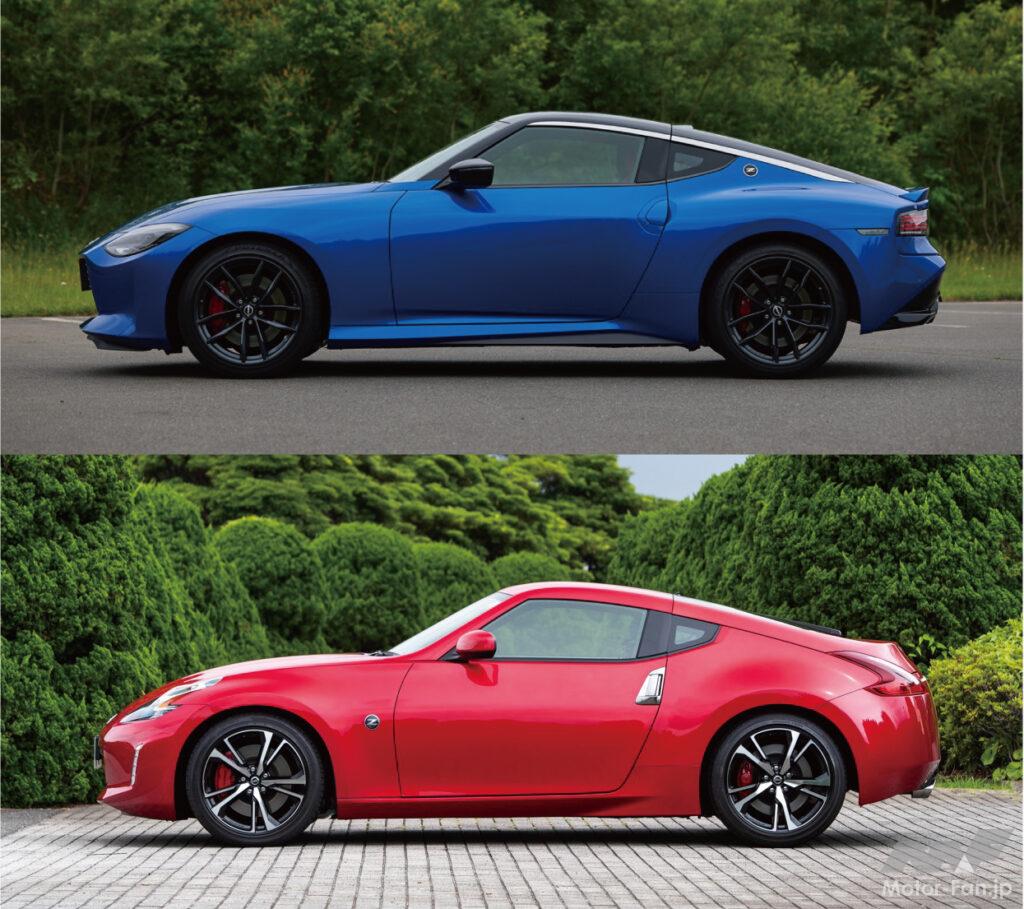 まずはボディサイズを比べてみよう。先代モデル(Z34)からプラットフォームは改良流用のため、全幅・全高・ホイールベースは変更なし。全長のみ120mm延長されている。また、サイドビューを見るとAピラーやルーフの角度、ウインドウの形状などは新旧で同じに見える。