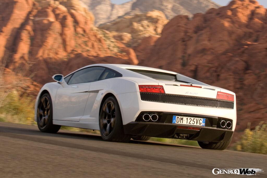 2003年のデビュー。1999年にフォルクスワーゲングループのアウディ傘下となり、1990年代前半に一度はキャンセルされたV10ベビーランボ開発が復活。アウディR8の姉妹モデルとすることでコストを抑え、ランボ史始まって以来、最も多い台数レベルでの量産を試みた。