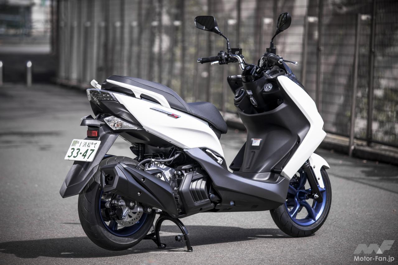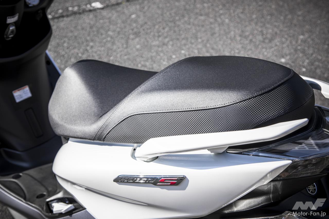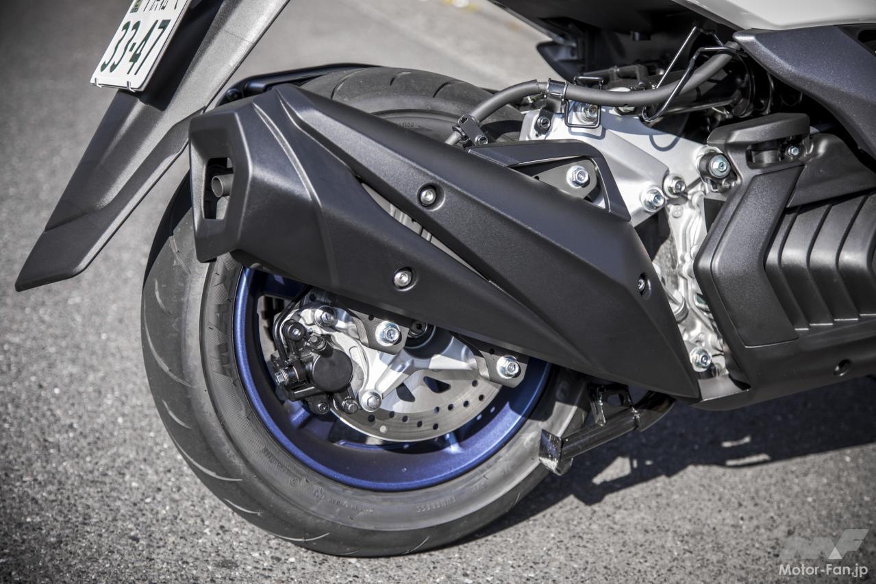ハンドリングについては、前後タイヤはマジェスティS用に専用開発された台湾製のマキシスR1Nで、フロントが120/70-13、リヤが130/70-13サイズ。接地面積の大きなハイグリップタイヤが、低速時の機敏な動きと、高速時の安定感の両立につながっている。