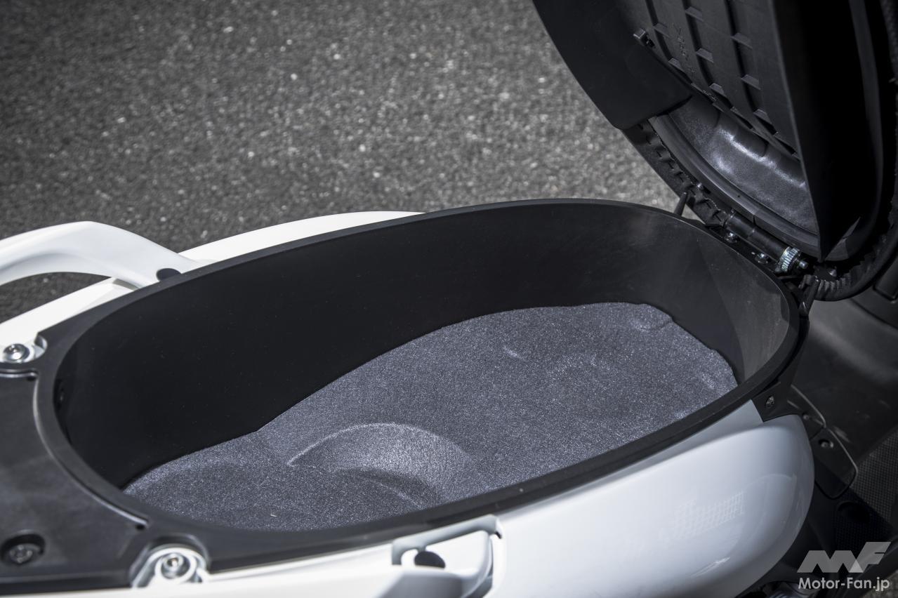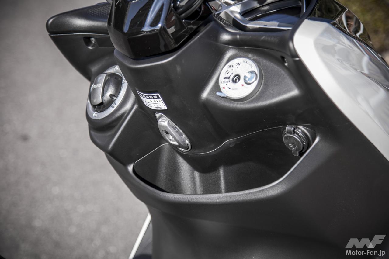 シート下トランクは32ℓと、このクラスではトップクラスの大容量。メインキー操作でオープンするので手軽で、ヘルメットと小物を同時に収納できるのがなにかと便利だ。ハンドル下の収納部はオープンタイプで使いやすいが、雨天時やセキュリティには注意が必要だ。また、この収納部にはスマートフォンなどの充電に役立つ12VのDCジャックも装備している。
