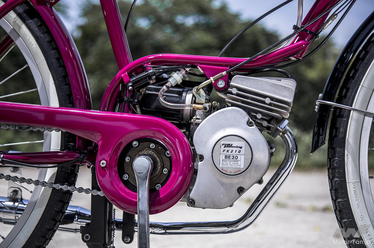 燃料コックをONにし、センタースタンドを掛けた状態で左右のペダルを吹き込めば、エンジンは簡単に始動。センタースタンドを払い、またがってみた最初の感想は、想像以上に車体が軽い!ということ。軽量コンパクトな空冷2ストローク単気筒31.7ccのBE30エンジンは、見た目以上に重量が軽い模様で、「自転車にエンジンが乗っている」という感覚がまったくない。