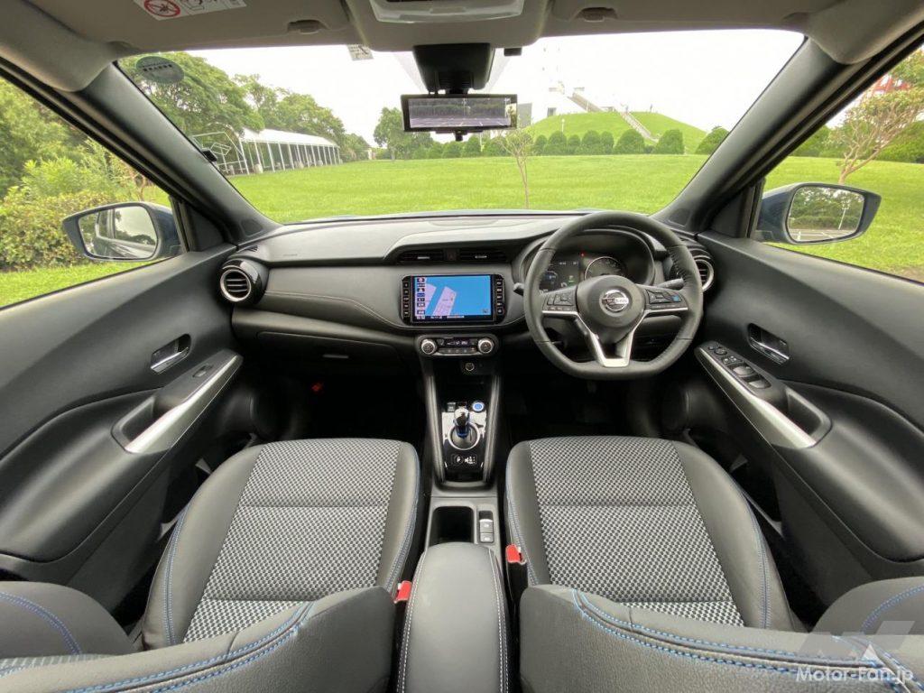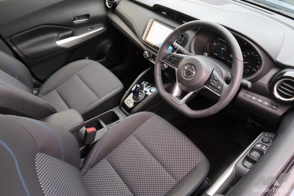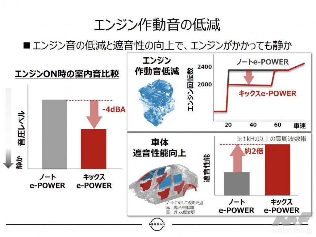 車速が上がってロードノイズや風切り音などの走行音が大きくなるにつれ、エンジンの始動頻度は高くなる。だが、メーターにエネルギーフローを表示させて注意深く観察していない限り、エンジンがかかったことに気づかない。音に変化がないし、ショックも感じないからだ。キックスはベース車に対して骨格を強化して剛性を上げるなどし、振動伝達感度を大きく下げた(乗員に伝わりにくくした)という。ダッシュパネルに厚いインシュレーターを入れて、振動・騒音を抑えてもいる。これらの対策が奏功している印象だ。エンジンがかかるとうるさかったノートe-POWERに比べ、キックスは格段に静かで、大きな進化を感じる。