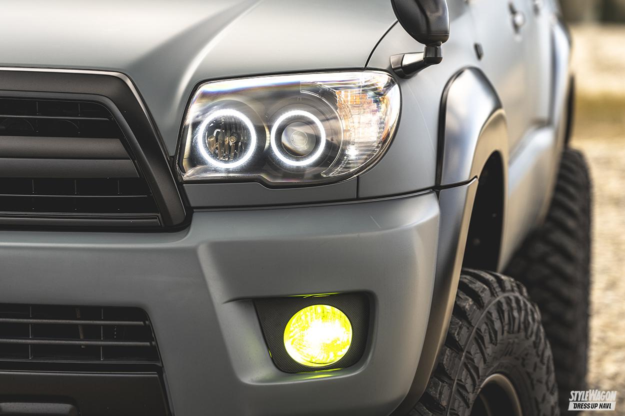 ラングラーのアンヴィルをモチーフにしたマットカラーにマットブラックを加えたツートンボディへ、フレームが見えないようにFJクルーザー用プロコンプ6インチアップキットを投入したReiさんの215系ハイラックスサーフ。2インチアップが主流ということもあってミーティングでは注目度バツグンなのだが、信号待ちでハイエースと並んだ際に目線が同じという部分だけが悔しいそうだ。なお、ワイルドオーラを放つエクステリアに対し、インテリアはキュートさが備わるようにデニムのシートカバーをあしらっている。