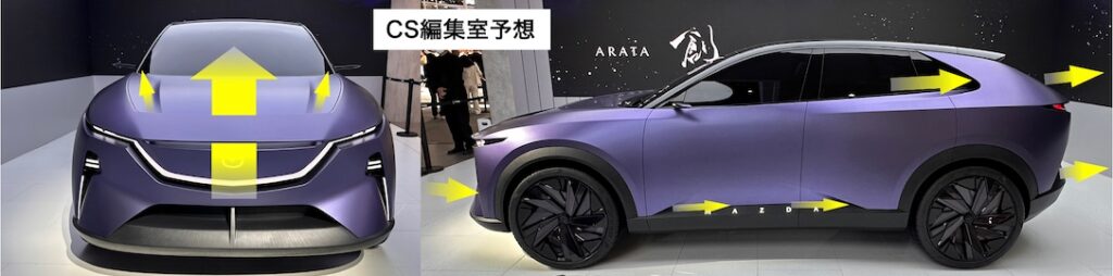 According to Yoshito Iwauchi, Chief Designer of Mazda’s Design Division, who interviewed me about the EZ-6, another new electric vehicle that Mazda unveiled at the Beijing Motor Show, “ARATA is being handled by Chief Designer Kimoto, who did the CX-50. He also worked on the minor changes of the Mazda2. It seems that Eiji Kimoto is in charge of ARATA.