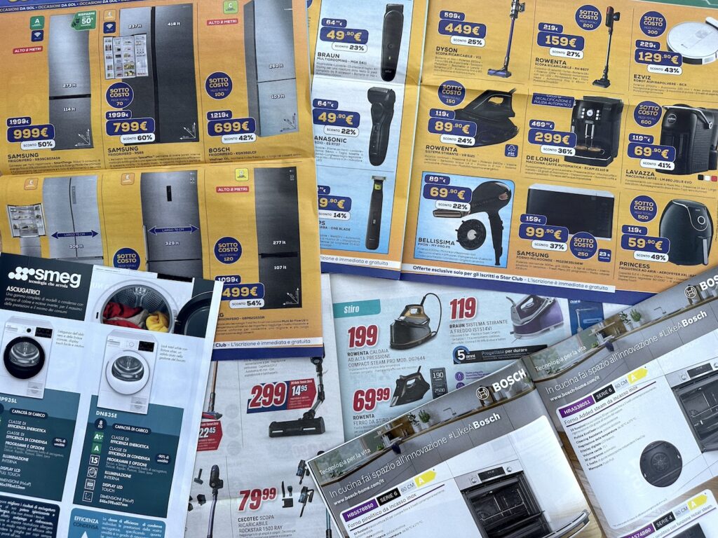 店内における陳列風景を代弁してくれるのはチラシ広告です。今回は、欧州全域で展開している家電量販店「エウロニクス」のイタリア版チラシ 2024年5月23日-6月5日号を開いてみました。