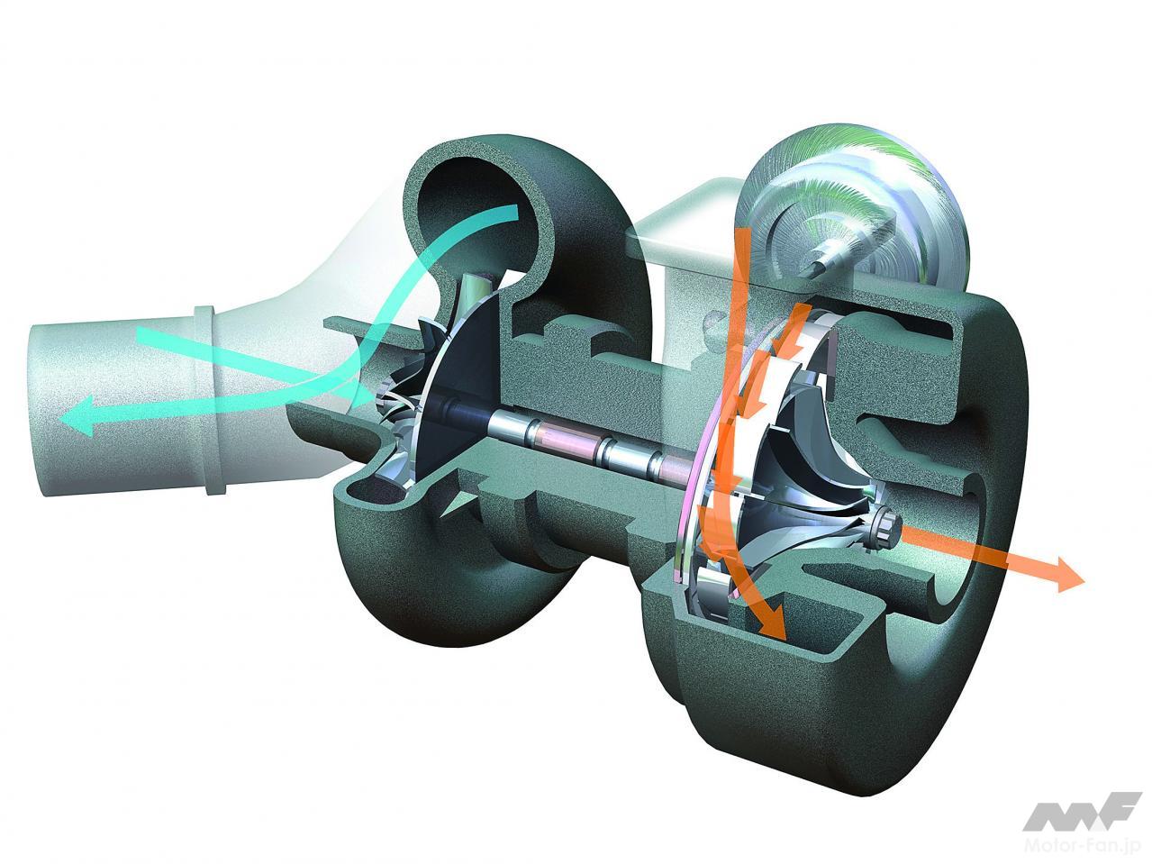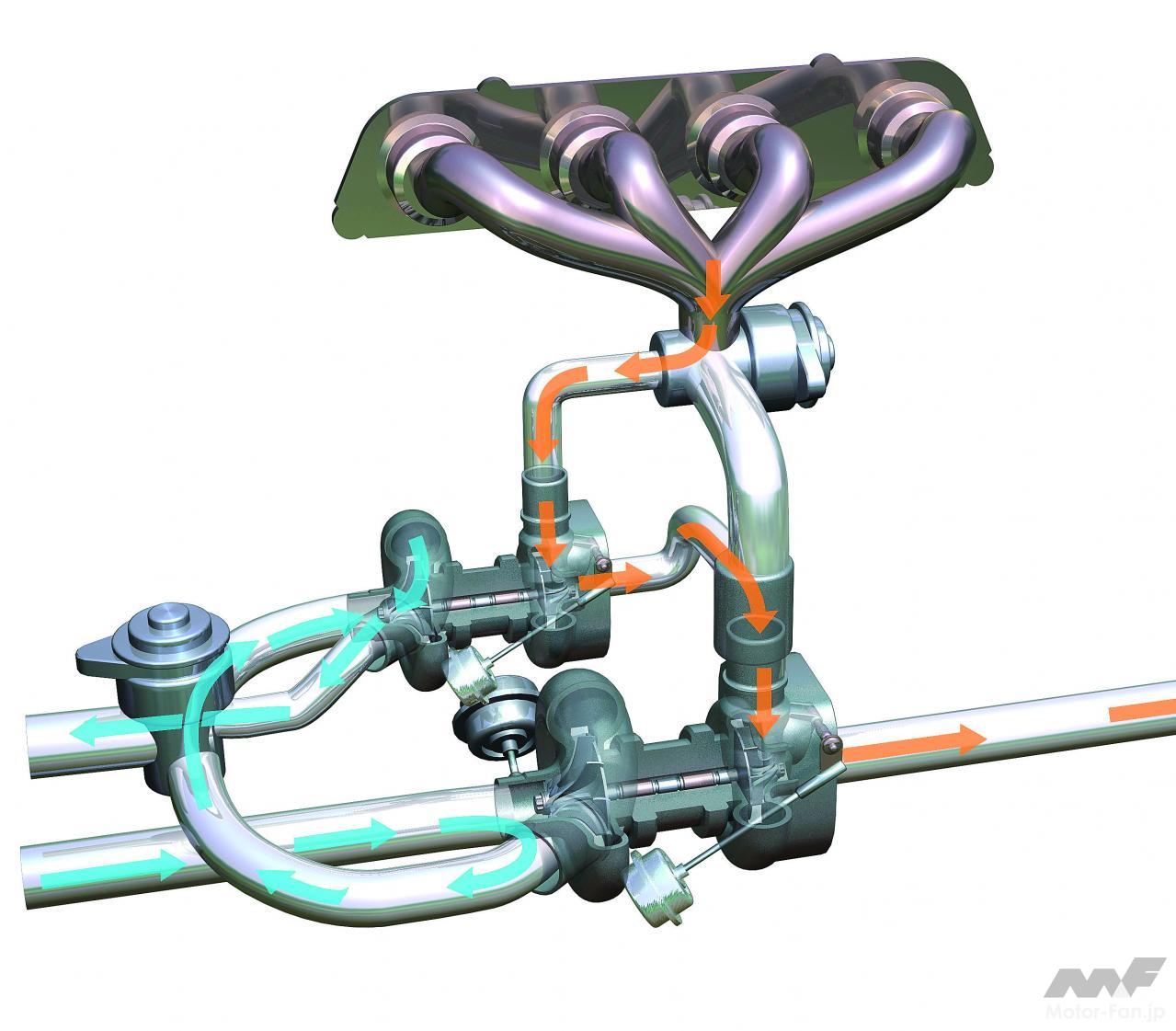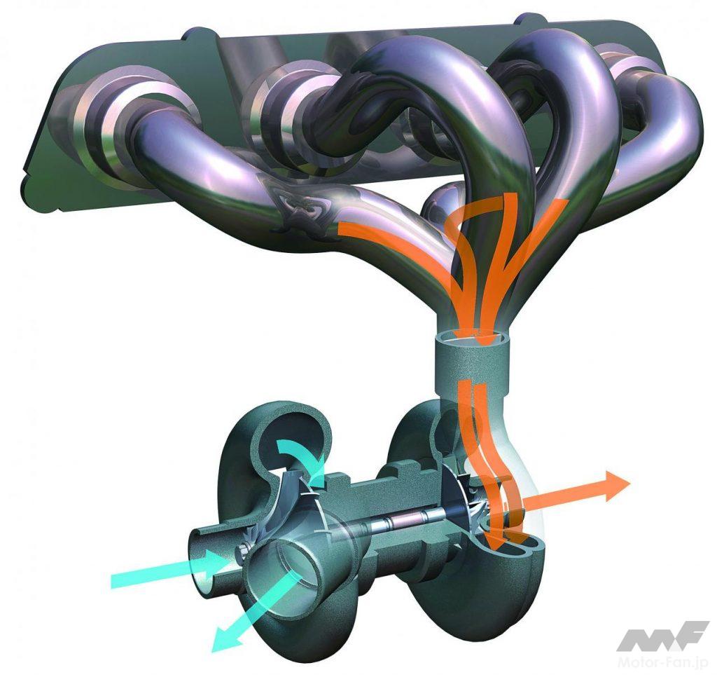 何が「ツイン」かというと、タービンハウジング内の流路。4気筒エンジンにおいて、排気バルブが同時に開かない1番4番マニフォールドと2番3番マニフォールドを別流路にすることで、管内を流れる排ガスが干渉しないようにし、タービンホイールを回転させるエネルギーをロスなく得ることを企図した構造にしている。ご想像のとおり、コスト面では不利。それに対して通常のタービンハウジングを持つターボチャージャーは、区別する際にシングルスクロールと称されるようになった。