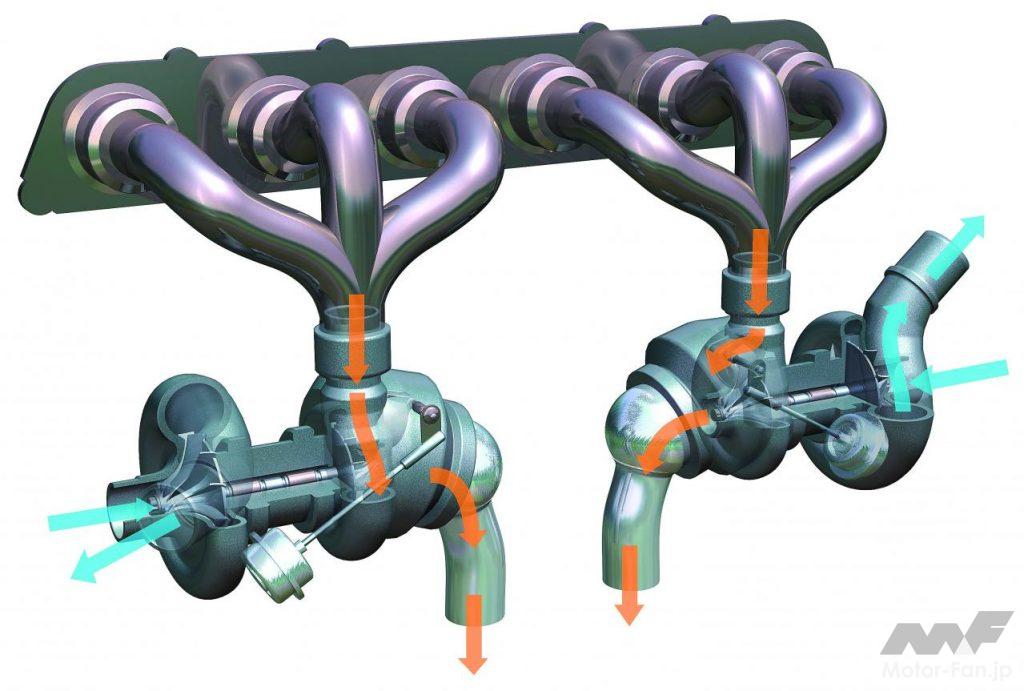 単純にふたつのターボチャージャーを別流路で用いるタイプ。画像では直列6気筒の前後で3気筒ずつ、V型エンジンでは両バンクそれぞれにターボを備えればツインターボになる。