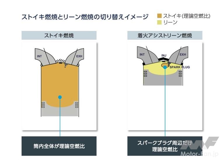 郊外路を一定速で走る、高速道路で80km/h巡航ならリーン燃焼。エンジンの暖機が終わっていたら、おとなしく走っているときはほぼリーン燃焼でいけるという。そこから先は通常のストイキ燃焼に切り替わるが、その切り替えをドライバーが気づくことはないほど自然に切り替わる。「λ=2から1への移行は、センサーを駆使してショックがでないように切り替えます」とのことだ。