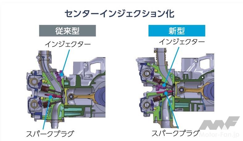 着いた火を消さないように制御するのは、基本的にシリンダー内の空気の流れ(タンブル流)を強化することで対応したという。S/B比(ストローク/ボア比)をロングストローク化することで吸気流速が高まったため、タンブル・ジェネレーターバルブは新型では廃止された。