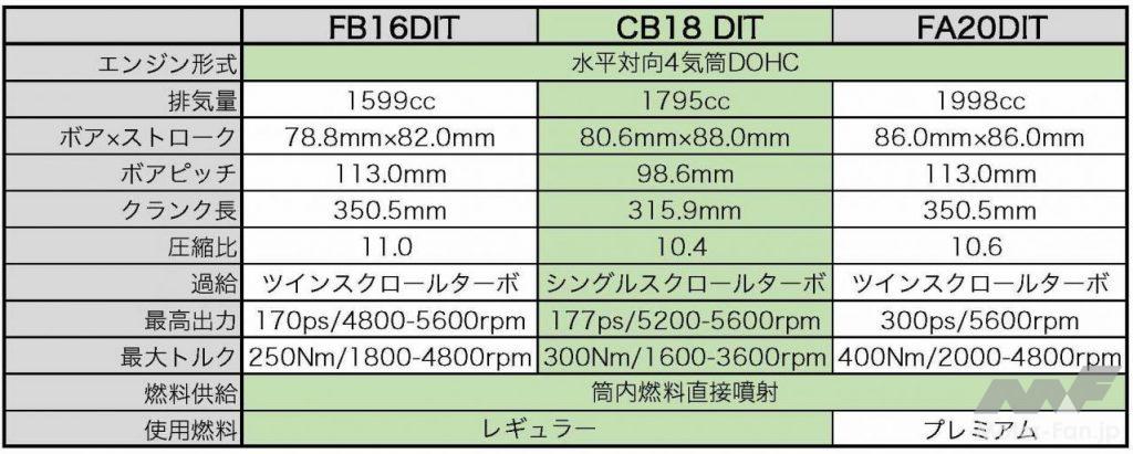 このCB18DIT(過給エンジンのみだからあえてDITをつける必要はないが)型は、現行FB16DITの代替として開発された(FB16型は自然吸気とターボエンジンがある)。