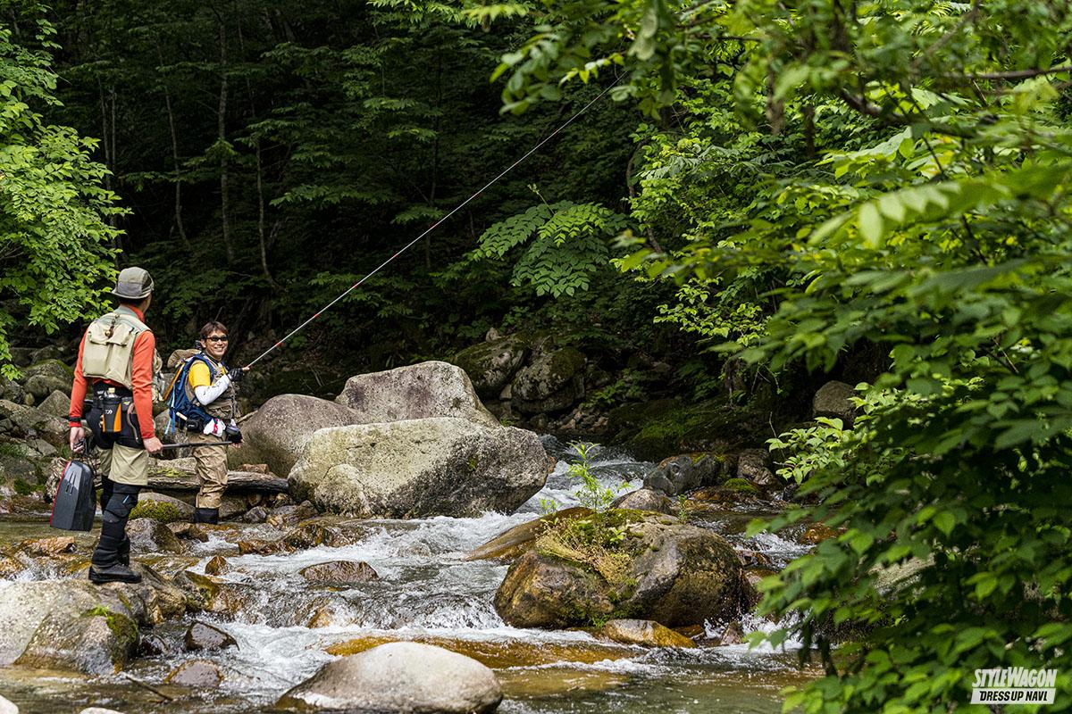 ターゲットは、岩魚と山女魚。なぜ山岳渓流が熱いのか?まず、ポイントとなるフィールドだ。乗用車ではまず行けない場所までジムニーで進み、そこから両手をフリーにした装備で、ほぼ登山の様相でポイントを目指す。やったことがない人から見ると「えっ?こんなところに魚いるの?」と思ってしまうような川幅まで登る。狭い場所だと川幅1メートル以下まで狭くなり、水深は10センチ以下まで浅くなる。さらに、そのシチュエーションだ。1メートル以上の大岩がゴロゴロ。身にまとう装備は、ウエットスーツを着込んだゲータースタイルか、ハイチェストと呼ばれる胸まである長靴のようなウェーダーを着て、川の中を歩く。靴のソールはフェルト。岩についた苔に対し、グリップを確保する為、普段履きではまず使わないフェルトを使用する。竿以外の装備をフィッシングベストや、リュックなどに入れ、両手をフリーにしてほぼ山登りのイメージ。場合によっては、ザイルなどを使い、滝を回り込み、壁にしか見えない場所を登る。