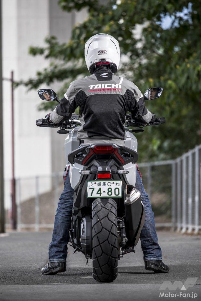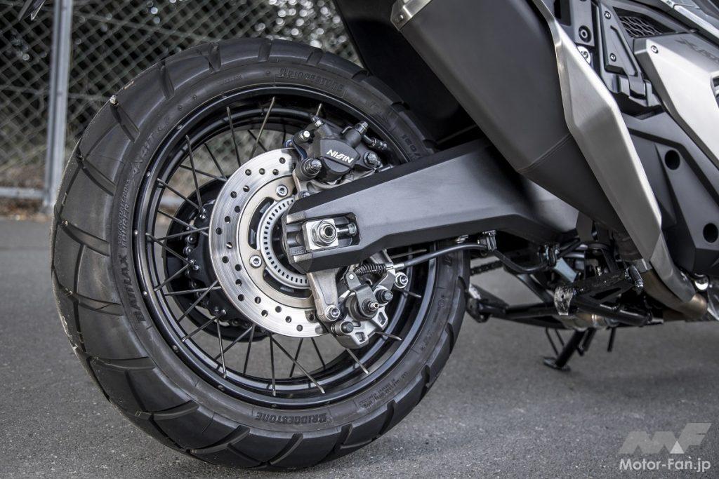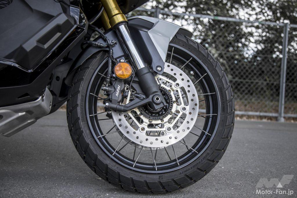 写真からもわかる通り、X-ADVは一見スクーターの様なフォルムを見せる。しかし、大径スポークホイールの採用といかにも足の長そうな前後サスペンション。そしてユトリを感じさせるロードクリアランスも印象深い。