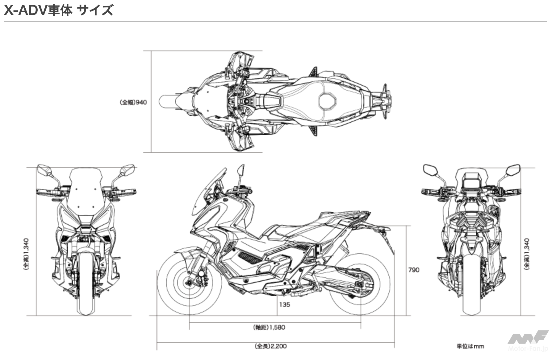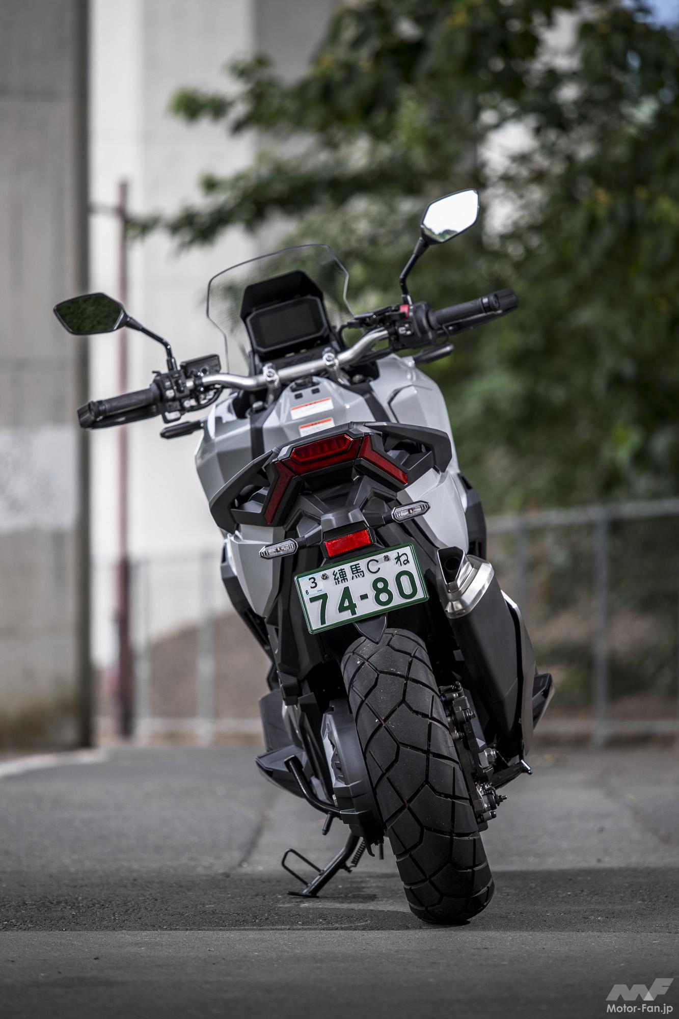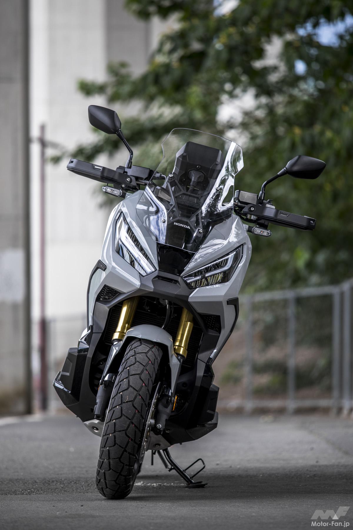 写真からもわかる通り、X-ADVは一見スクーターの様なフォルムを見せる。しかし、大径スポークホイールの採用といかにも足の長そうな前後サスペンション。そしてユトリを感じさせるロードクリアランスも印象深い。