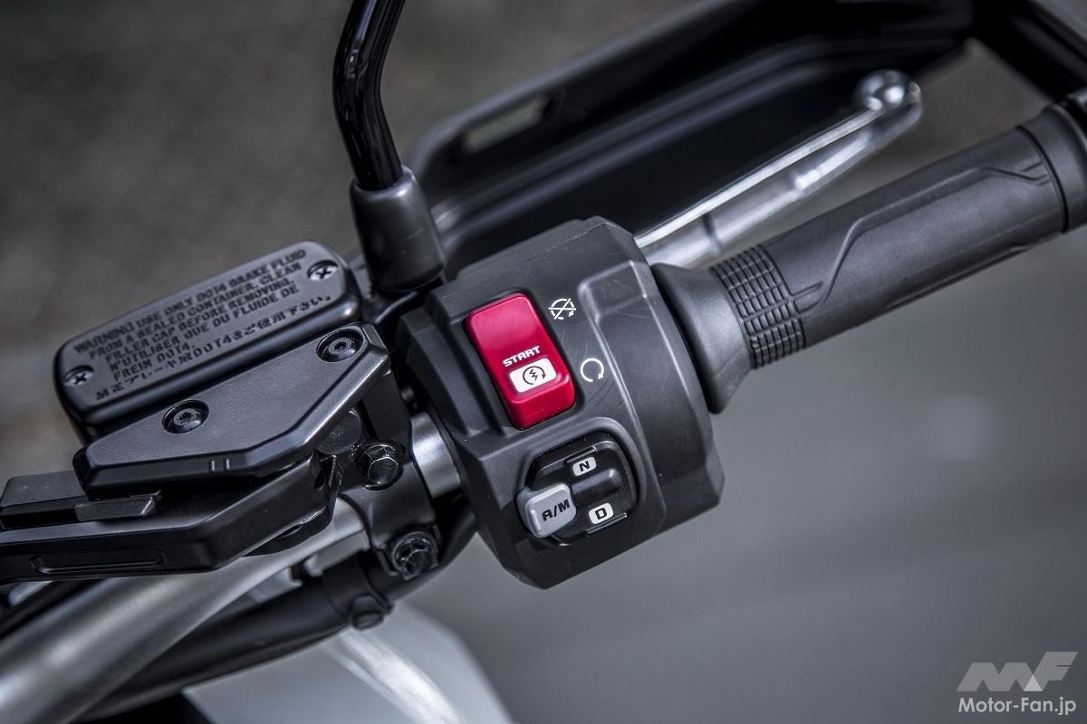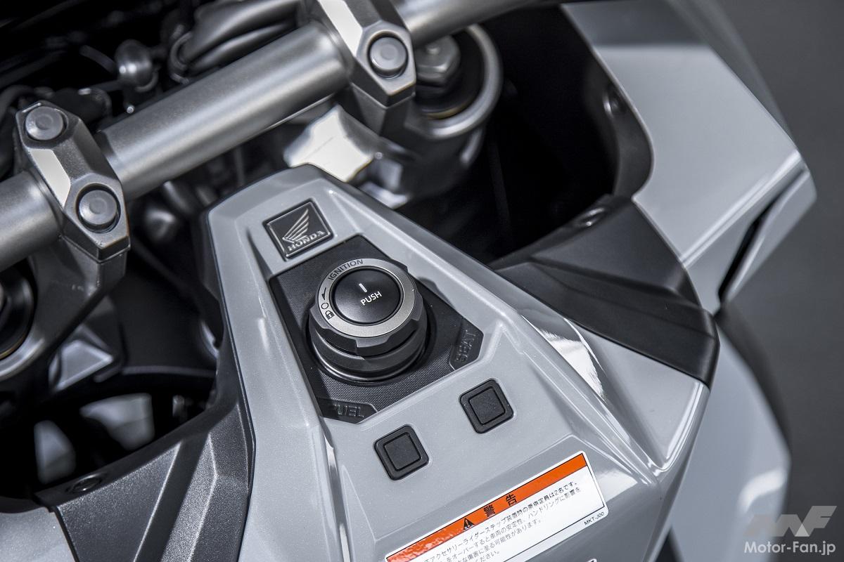 イグニッションの操作はダッシュパネル中央の大きな丸いスイッチを押す。もちろんスマートキーを身につけた上での話だが、それはまるでクルマのスターターの様。実際の始動は右手の赤いスタータースイッチを押すが、NCシリーズ一連に搭載された並列ツインの静かなエンジンは、カウルに覆われてさらにメカノイズが抑えられているように感じられた。