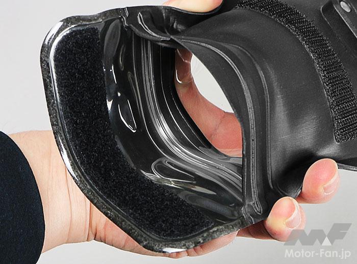 透明な画面密着部は、非常にクリアで視認性も良好。しかも高感度なタッチスクリーン対応としており、革厚のグローブ越しでは厳しいが、素手ならば仮に雨で濡れていても、スムーズにスマホ操作可能。