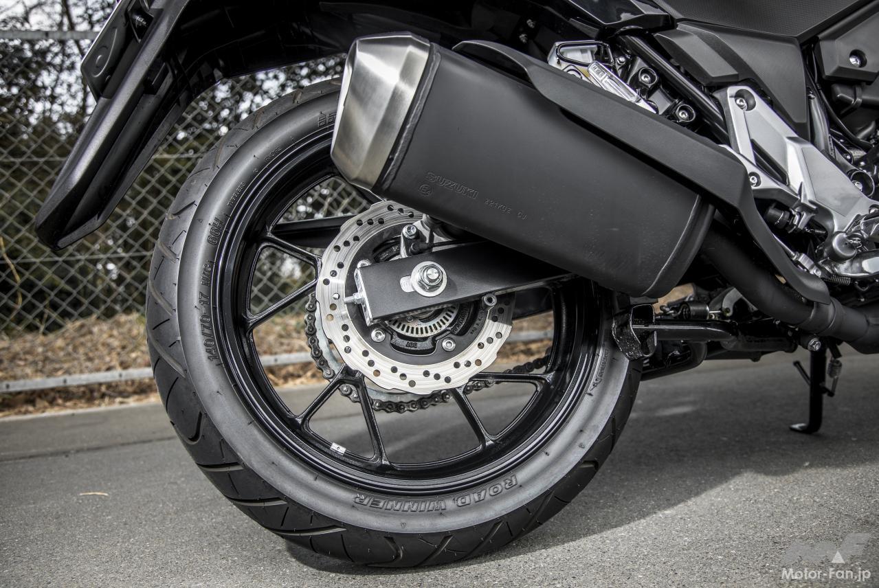 ハンドリングは、エンジンと同等以上に扱いやすい。ディメンションをチェックすると、GSX250Rに対してキャスター角がわずかに立っており、さらにトレールとホイールベースが短くなっている。ホイールトラベル量は未発表だが、フロントフォークは専用セッティングが施されているという。これらがうまく作用しているのか、250ccとしてはやや重めのバイクでありながら走り出してしまえば動きは軽快で、まるでネイキッドのようにスムーズに向きを変える。