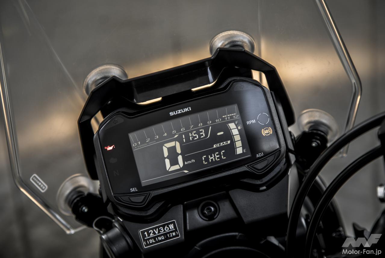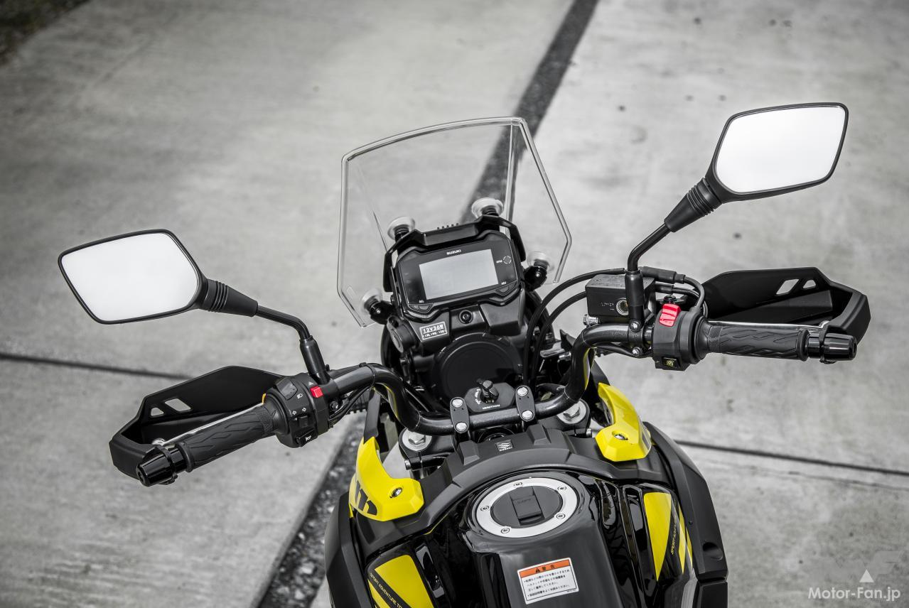 まずはライディングポジションから。アドベンチャーモデルは最低地上高を稼ぐためにどうしてもシート高が高くなりがちだが、車体をGSX250Rと共有するVストローム250はシート高が800mmと低く、足着き性は抜群にいい。これも多くのライダーに支持されている理由の一つだろう。ハンドルバーはグリップ位置が高くて狭く、この部分はアドベンチャーのイメージからやや離れるが、これによって形成されるコンパクトなライポジは一般道で操縦がしやすく、むしろ都合がいい。