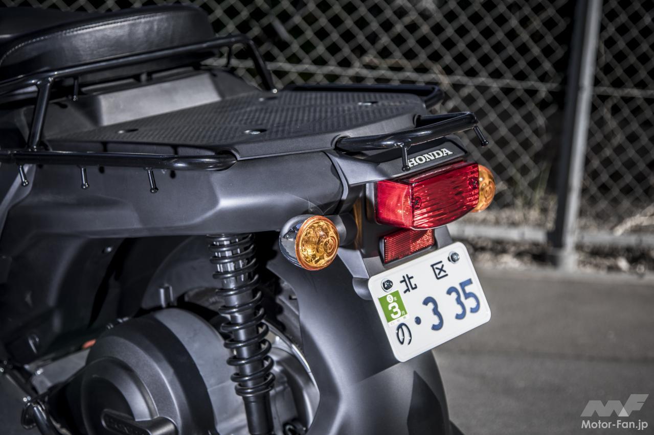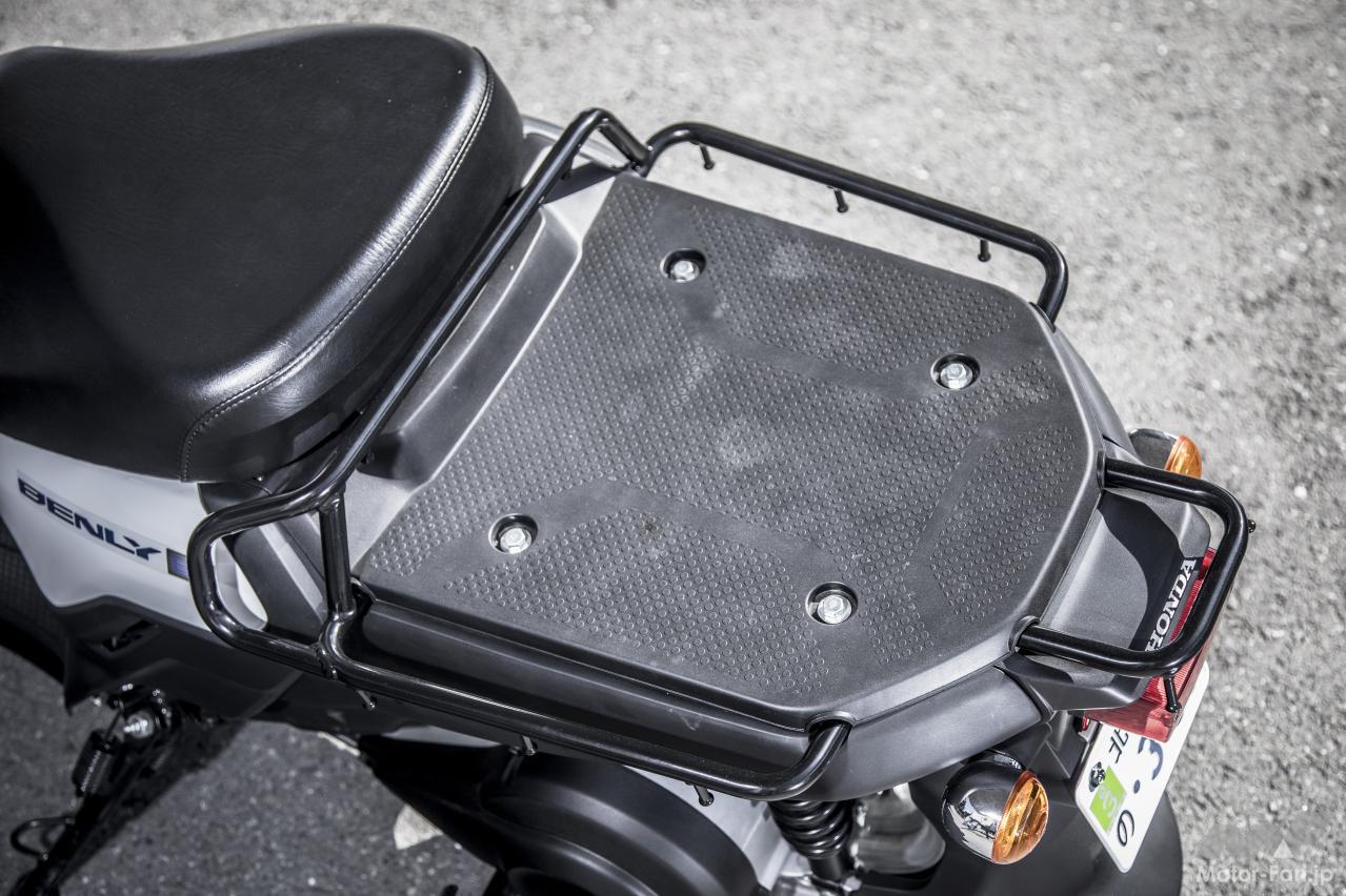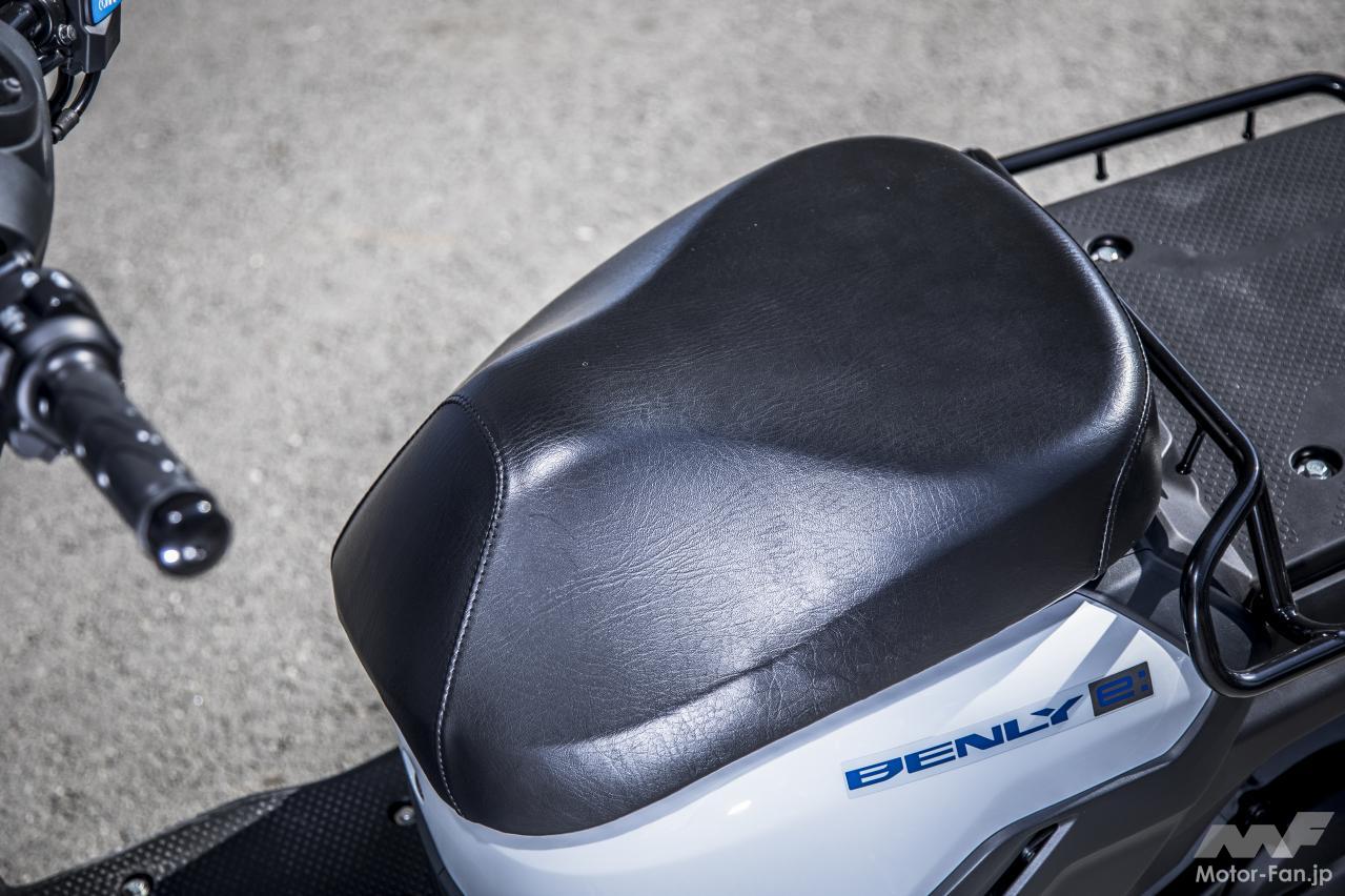 ボディデザインはビジネスバイクとして従来からあるベンリィをベースとしています。そのため見た目に目新しさは感じませんが、長年の実績があるので信頼性は高いと思います。装備面での相違点は、ヘッドライト形状が六角形でLEDを採用しているところです。車重は125kgあります。そのため取り回しは重たいです。1個11kgあるモバイルパワーパックを2個搭載しているのがやはり、重量的には不利です。ちなみにガソリンエンジン車のベンリィに比べると車重は15kg重たいです。実際の走行でどのように影響するのか気がかりでした。