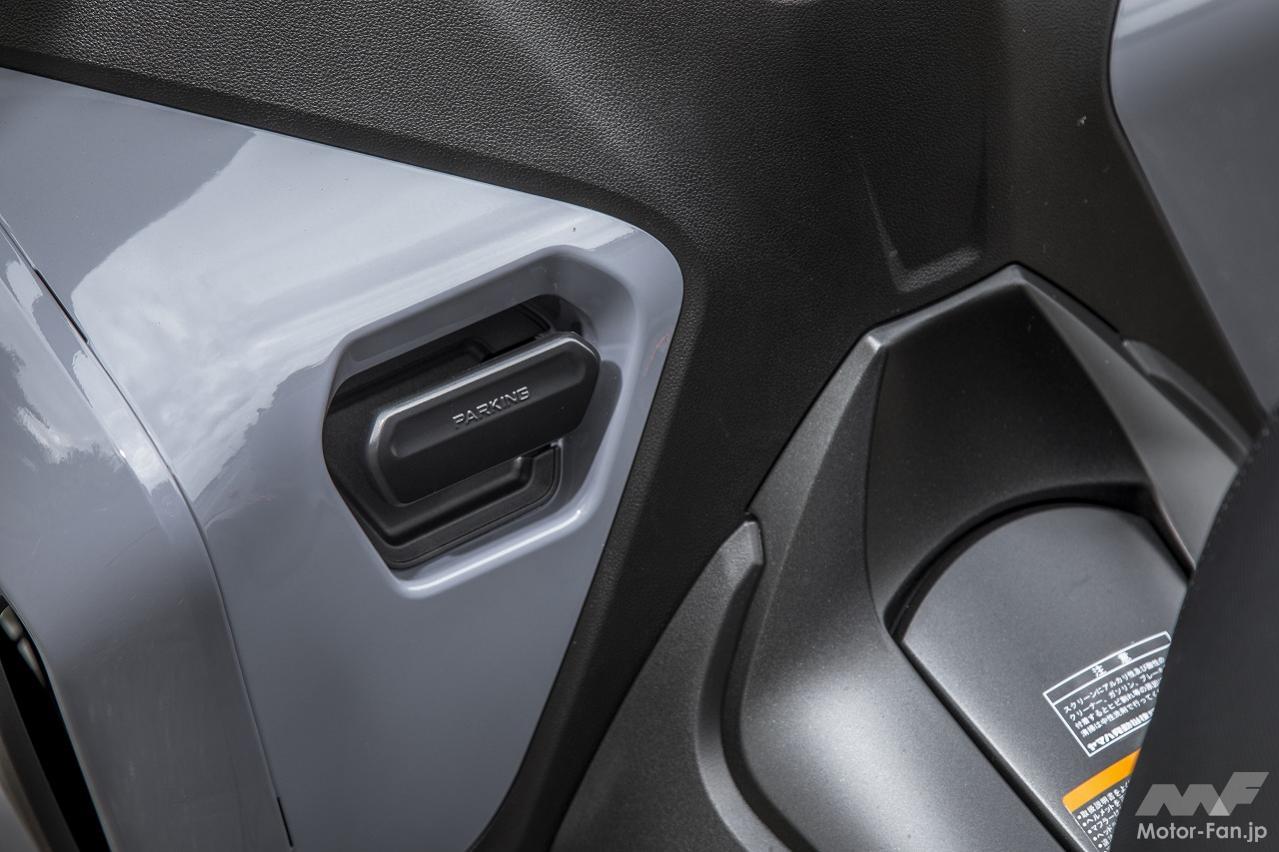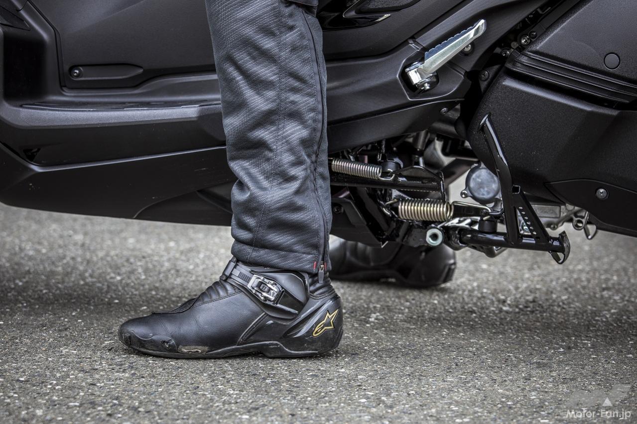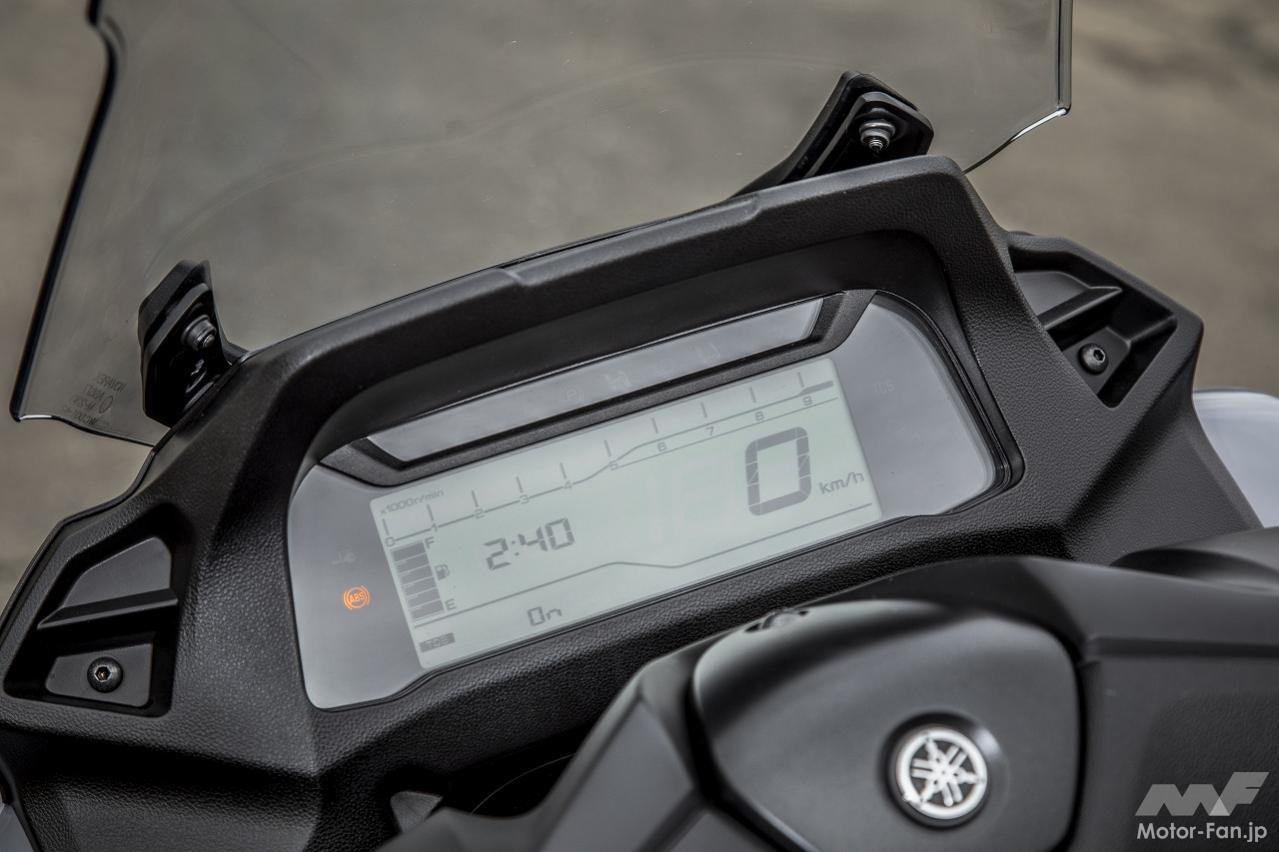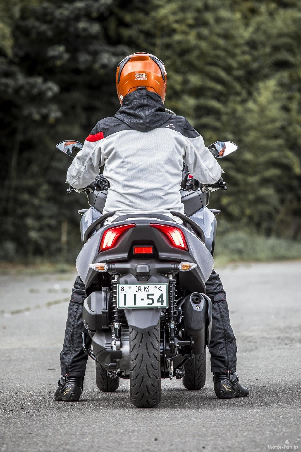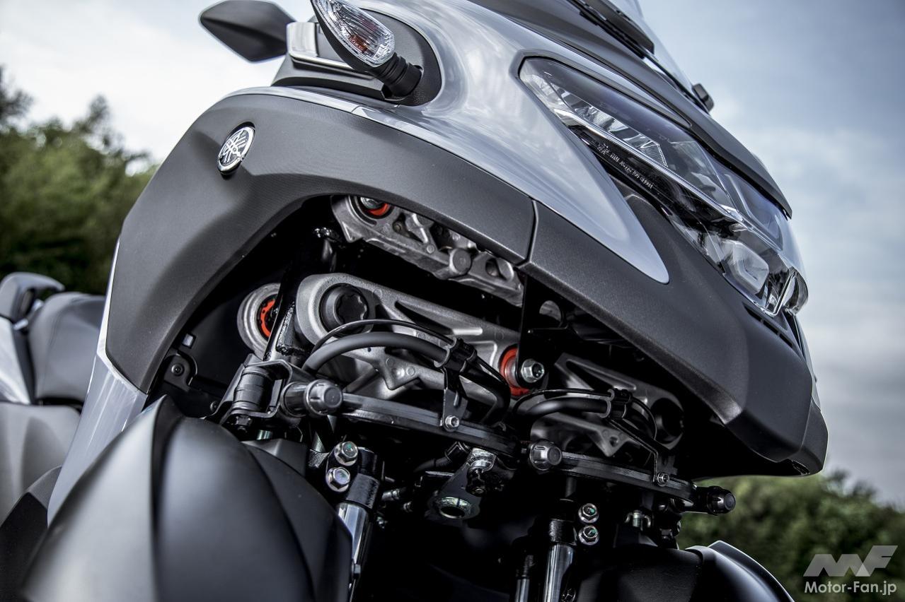 街中でもフロント2輪の安定感は魅力で、車幅も見た目とは違って通常のバイクとほぼ変わらないため、渋滞路でもスイスイと前に出られる。そして、初のスタンディングアシスト機構が便利。信号待ちでもふら付きにくく、慣れてくれば両足を乗せたままストップ&ゴーもできてしまうほど(ヤマハでは推奨していません)。車体垂直のままロックされるので駐車場での取り回しなども車重のわりには楽だ。ラゲッジスペースも広々していて、ビジネスだけでなくツーリングにも重宝しそう。そう考えると、快適ツアラーとしての資質も十分あると見た。