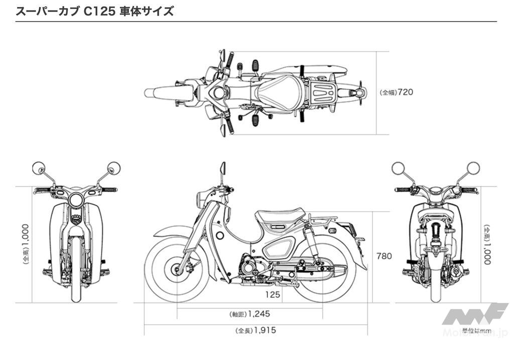 スーパーカブ C125 車名・型式:ホンダ・8BJ-JA58 全長(mm):1,915 全幅(mm):720 全高(mm):1,000 軸距(mm):1,245 最低地上高(mm):125 シート高(mm):780 車両重量(kg):110 乗車定員(人):2 燃料消費率(km/L):70.0(60km/h)〈2名乗車時〉 WMTCモード値(km/L):68.8〈1名乗車時〉 最小回転半径(m):2.0 エンジン型式:JA58E エンジン種類:空冷4ストロークOHC単気筒 総排気量(cm³):123 内径×行程(mm):50.0 × 63.1 圧縮比:10.0 最高出力(kW[PS]/rpm):7.2[9.8]/7,500 最大トルク(N・m[kgf・m]/rpm):10[1.0]/6,250 燃料供給装置形式:電子式〈電子制御燃料噴射装置(PGM-FI)〉 始動方式:セルフ式 点火装置形式:フルトランジスタ式バッテリー点火 バッテリー容量:12V-3.5Ah(10HR)[YTZ5S] 潤滑方式:圧送飛沫併用式 潤滑オイル容量(L):1 燃料タンク容量(L):3.7 クラッチ形式:湿式多板コイルスプリング式 変速機形式:常時噛合式4段リターン 変速比: 1速 2.500 2速 1.550 3速 1.150 4速 0.923 減速比(1次 / 2次):3.428 / 2.500 キャスター角(度):26° 30´ トレール量(mm):71 タイヤ(前/後):70/90-17M/C 38P(チューブレス) / 80/90-17M/C 50P(チューブレス) ブレーキ形式(前/後):油圧式ディスク(ABS)/ 機械式リーディング・トレーリング 懸架方式(前/後):テレスコピック式 / スイングアーム式 フレーム形式:バックボーン 製造国:タイ
