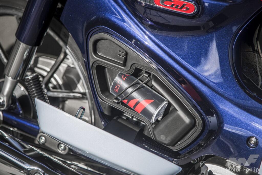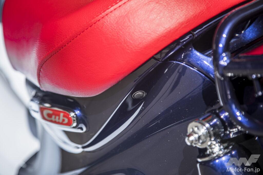 全体的なフォルムはスーパーカブそのものだが、クロームメッキパーツの多用や塗装の美しさ等、そこかしこに上質な仕上がりを披露している。