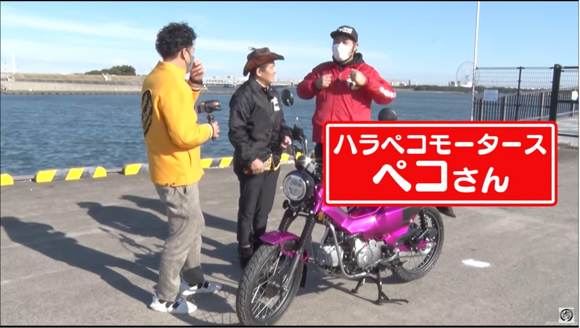 ハンバーグ師匠が登場するのは2020年12月に公開された「【ハンバーグ師匠コラボ】ハンターカブ新連載企画発進!?」の回。モトチャンプ編集長のチャボとハンバーグ師匠のトークにも注目で、ショッキングなカラーリングやネーミングの由来が語られている。