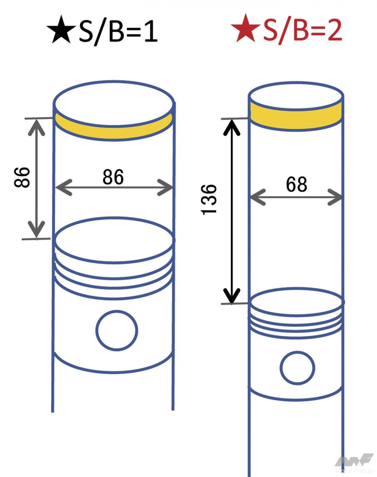 一般的にはS / B比が1.0を超えればロングストロークと呼ばれ、1.0を下回るとショートストロークと呼ばれる。最近の傾向では、燃費(つまりCO₂排出抑制)に振ったロングストロークエンジンは1.3程度である。なぜそういうエンジンが燃費型なのかといえば、冷却損失の小ささが理由だ。シリンダー内壁と燃焼室部分の表面積を計算すると、ロングストロークエンジンはショートストロークエンジンよりも小さい。これは、シリンダー壁面から冷却水に奪われる熱量が小さい、つまり熱損失が少ないことを意味する。