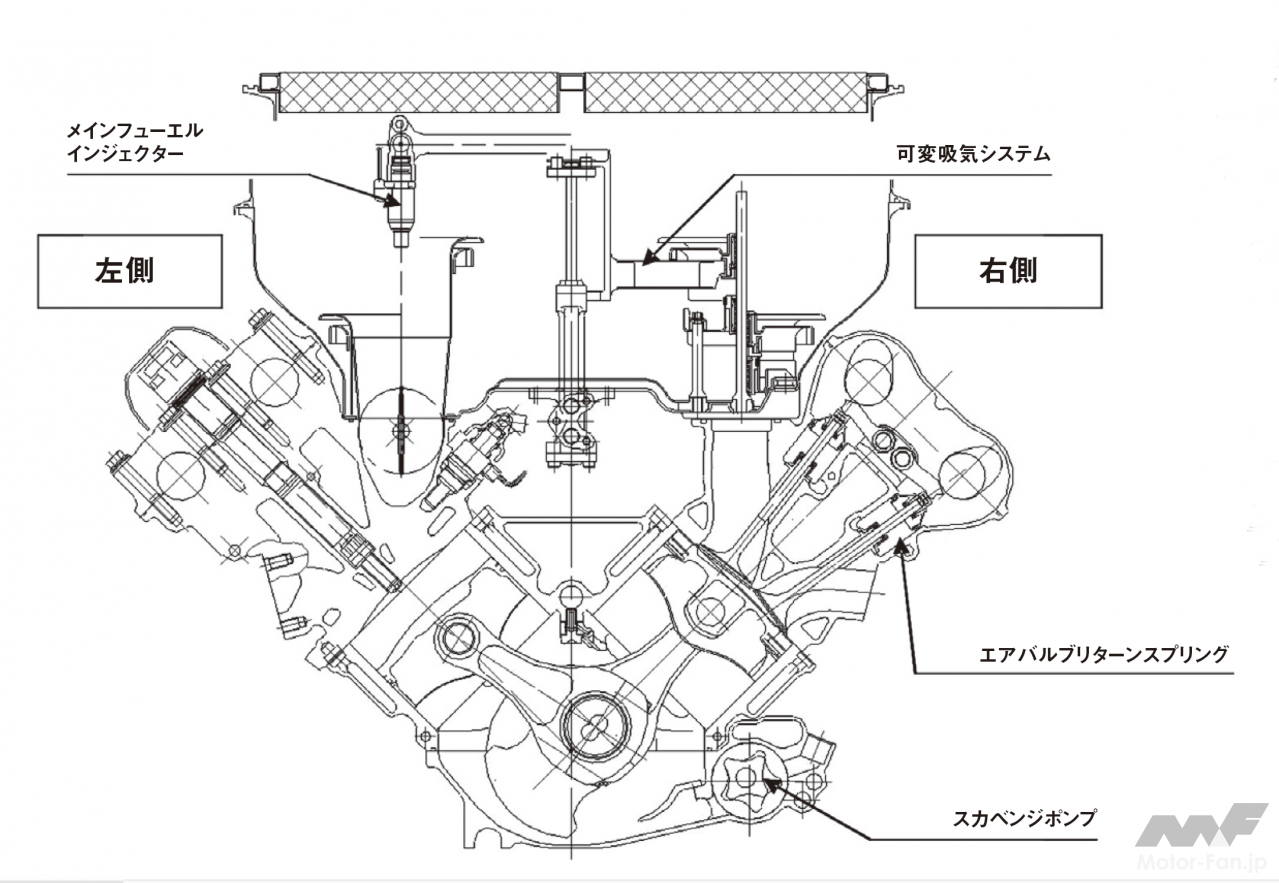 トルク重視型エンジンはロングストロークだと言われる。右の図はS(ストローク)/B(ボア)比が2、つまりストロークがボアの2倍というエンジンを示す。コンロッドがシリンダーライナーと干渉するギリギリのところで設計されたエンジンだが、ピストンが上死点から下死点まで移動する距離が長いぶんだけ受け取る仕事量が増えると考えていい。当然、エンジン高も高くなり車両搭載性の点で実現が難しい。