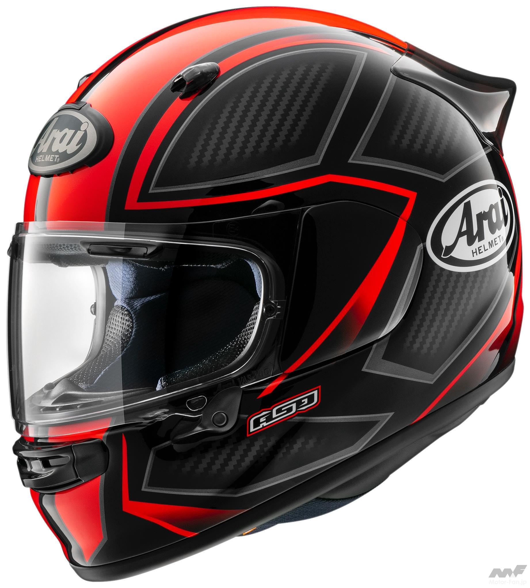 帽体はアライ独自の滑らかなフォルムと、強靭な帽体「PB-cLc2」を採用。より衝撃をかわす性能を高めるため、実績あるスネル規格のテストラインを目安にシールド取付け部分を24mm下げて、ヘルメット側頭部をより滑らかなフォルムとしている。