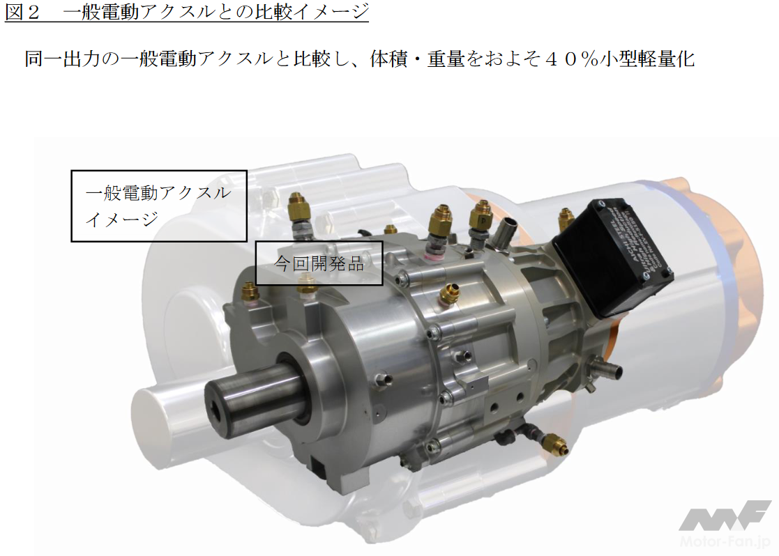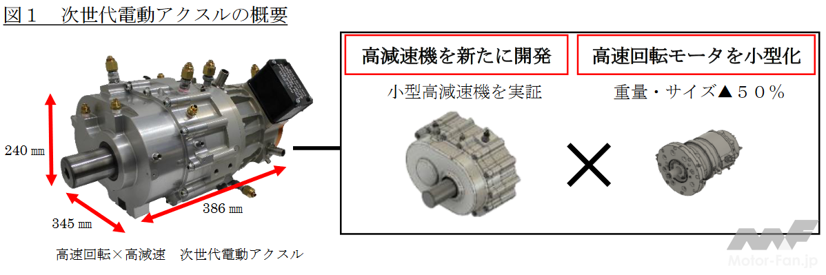 本電動アクスルは、「鍛鋼一貫」技術による新開発の高強度・高精度なギヤ・シャフト内蔵の小型高減速機と、Dy(ジスプロシウム)フリーボンド磁石「マグファイン」(※2)を用いた高速回転の小型軽量モータを一体化し、当社が長年培ってきた高い素材技術を融合したものである。