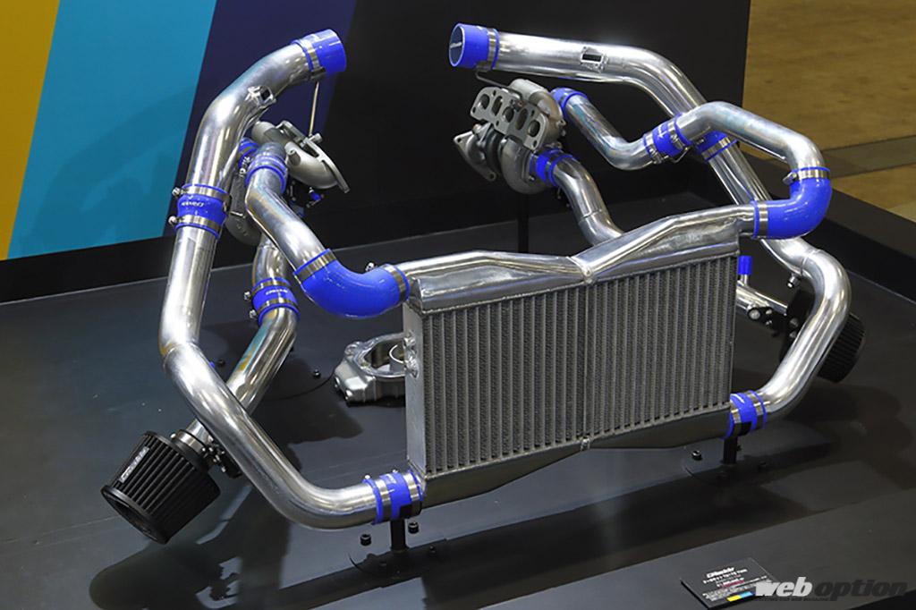 軸となるT517Zタービンは、軸受けがフローティングメタルでインペラ径はコンプレッサー側68㎜/タービン側56㎜。これを両バンクに一機ずつ配することで、エンジンチューン次第では550ps+αを狙うことも可能になる。