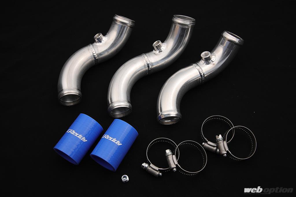 RB26用にオリジナルアイテムとしてリリースするのがアルミラジエターパイプ。PT1/8サイズの水温センサーボス付き/無しが用意され、さらにR32/R33/R34用でラインアップが分かれている。価格はボス付きが9680円、ボス無しが8580円となる。