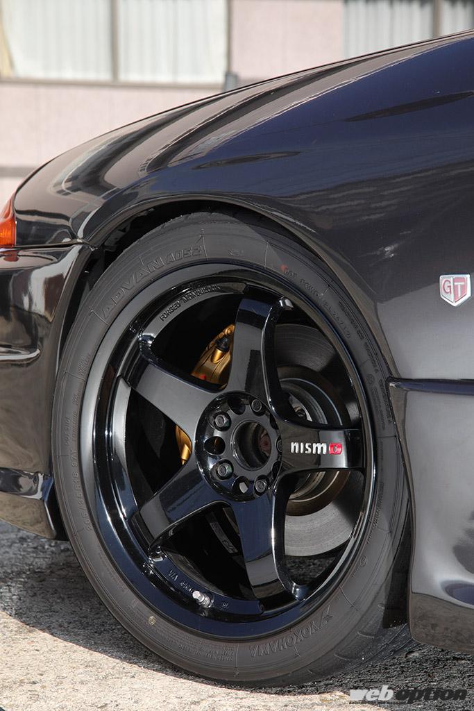 さらに長年乗り続けているオーナーの要望に合わせ、スタイリングの仕上げもサポート。足回りは10.5Jのホイールを納めるため、キャンバーなどのセッティングはもちろん、アームASSY(アッセンブリー)交換が基本となるブッシュなども打ち替え&ピロ化といった高度なセットアップもこなす。