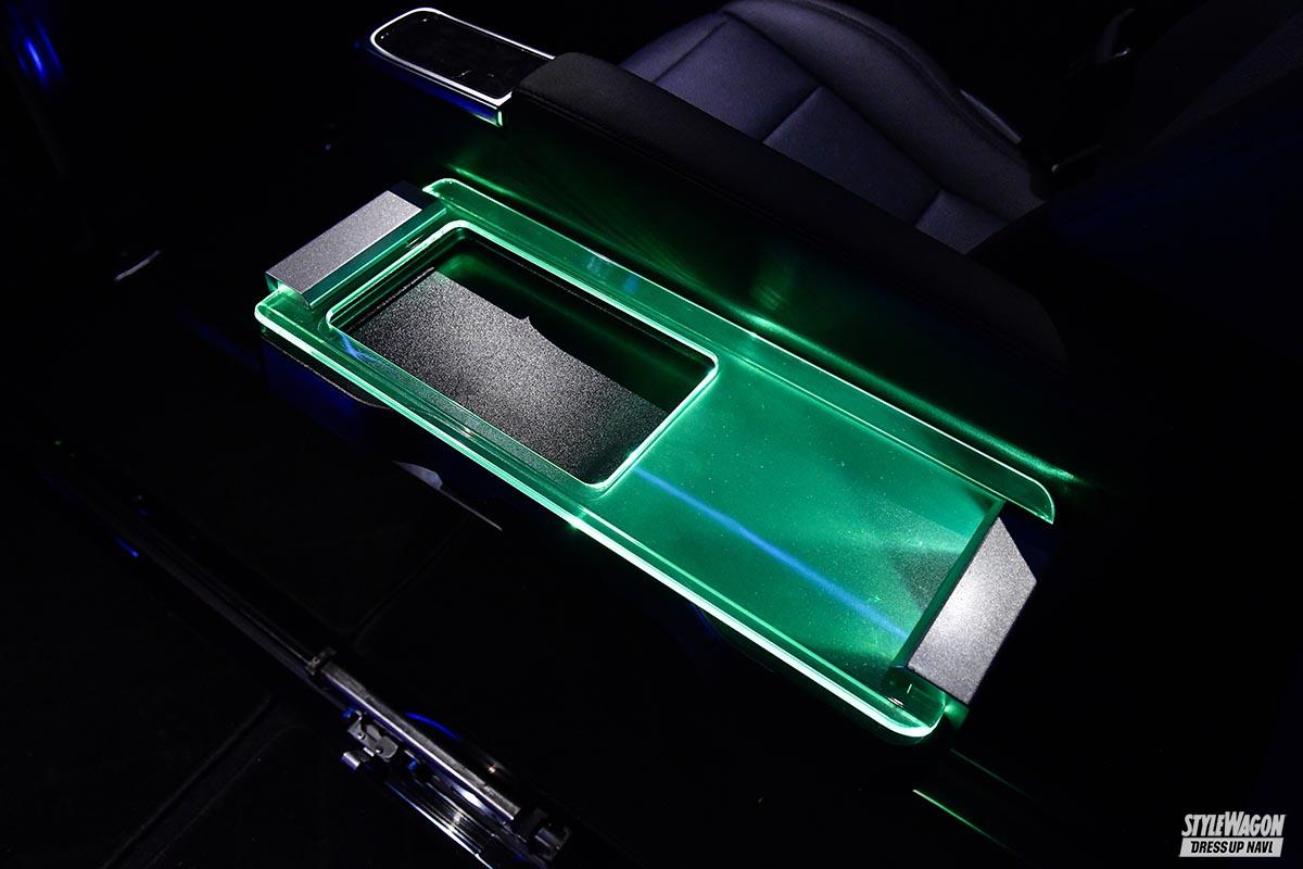 エッジまで美しく発光する間接照明が搭載され、まるでテーブルが浮かんでいるかのような印象をもたらす。その幻想的な光は、アルファード&ヴェルファイアにふさわしい抜群の高級感を演出してくれる。
